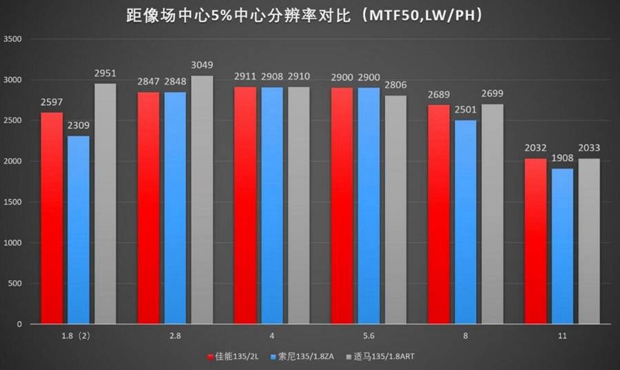 在稍微远离中心区,常用于人像拍摄黄金三分点的35%处,适马135 1.8ART开始抛离两位老爷爷辈的对手,基本实现了全程领先(除了f/8这种用得很少的光圈)。另外两支镜头的对比也是佳能135/2L好于索尼135/1.8ZA,这个还是有点令人惊讶——佳能135/2L比索尼135/1.8ZA整整早发布十年,能有这种表现也是相当令人意外了,可能也是那个年代135/1.8ZA为了冲击独一无二的规格,而在素质上稍有牺牲吧。