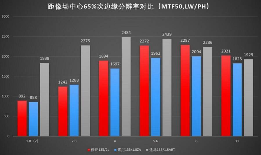 65%(外三分点)的画质对比和35%差别不大,135 1.8ART仍然保持着优势,佳能135L比索尼135 1.8ZA仍然是稍强一点。值得注意的是在这个点上适马135 1.8ART的最佳光圈到了f/4.0,而不再是偏中心位置处的f/2.8。