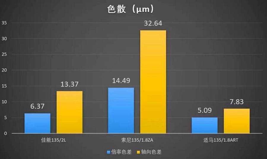 分为倍率色差(焦内色散)和轴向色差(焦外色散)两部分。计量各焦段下全画面色散的最大值,为其在像方焦平面(传感器平面)上的实际宽度。