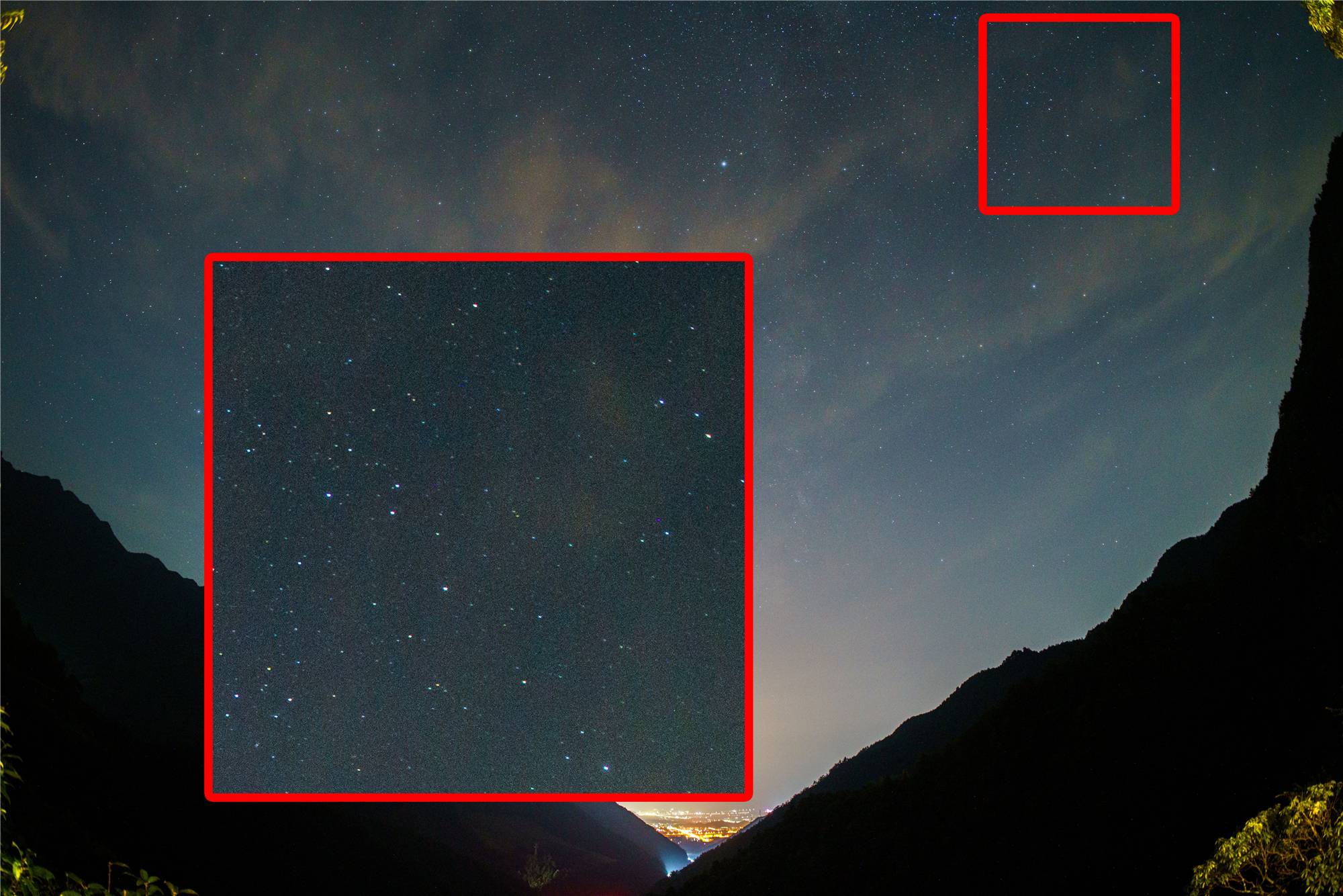 彗差方面,这个规格的镜头还是非常适合银河全景拍摄的,彗差控制也比较优秀,边缘部分的星点有轻微变形。
