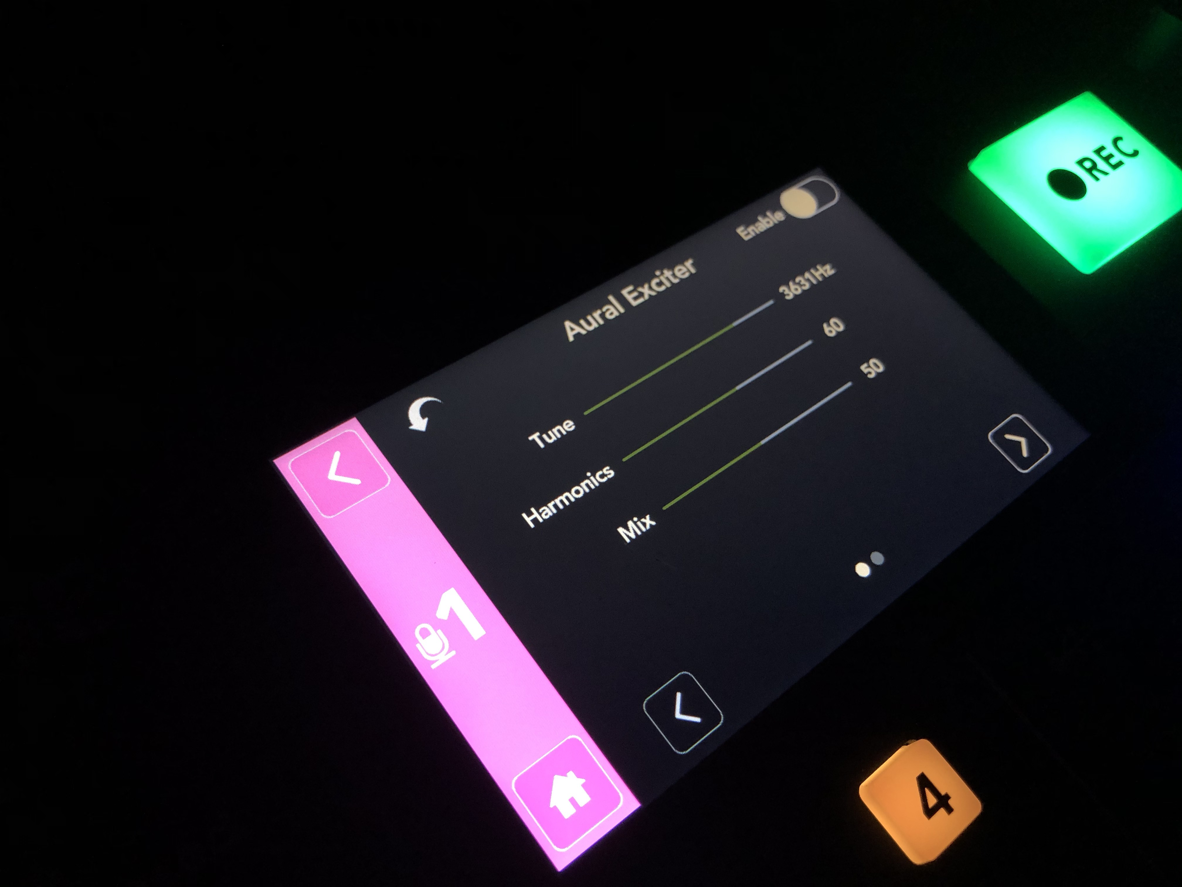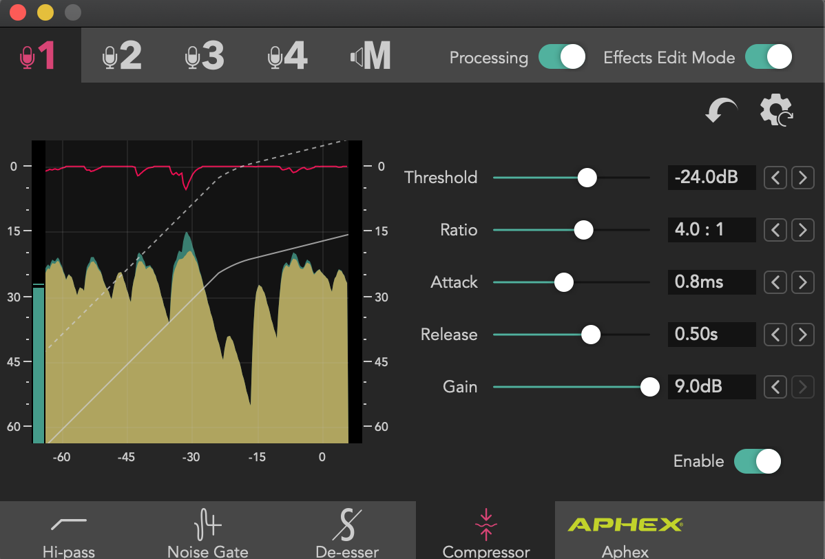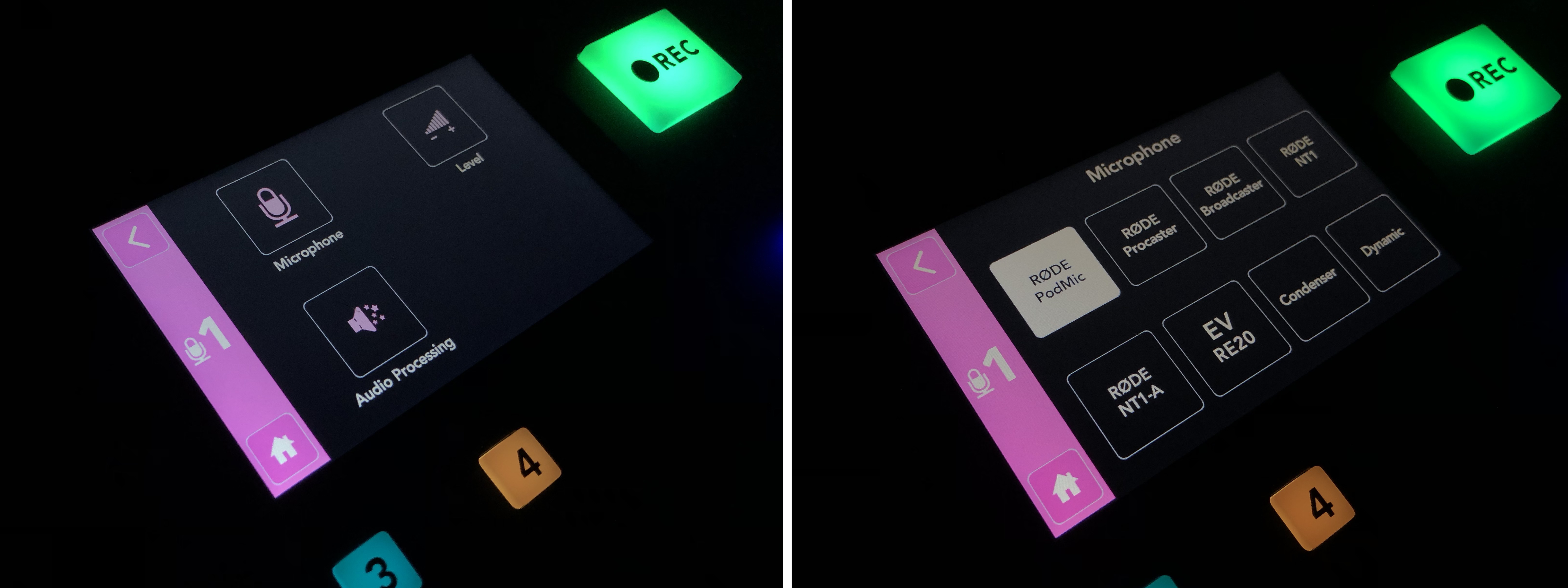 比如按下1号按钮,我们就可以看到界面变成设置 Microphone、Level和Audio Processing,点击Microphone 就可以进入子菜单看到麦克风预设的各种参数调整,插上之后,系统会自动识别。到底还是自家的产品香啊。这里还是要夸一下兰拓,这次体验的配件很足,虽说体验的主体是调音台,但是从话筒,到支架,到连接线,最后到耳机都准备齐全,基本上,一开箱,就可以弄起来了。(可惜由于个人时间的关系,很遗憾没能测试话筒……