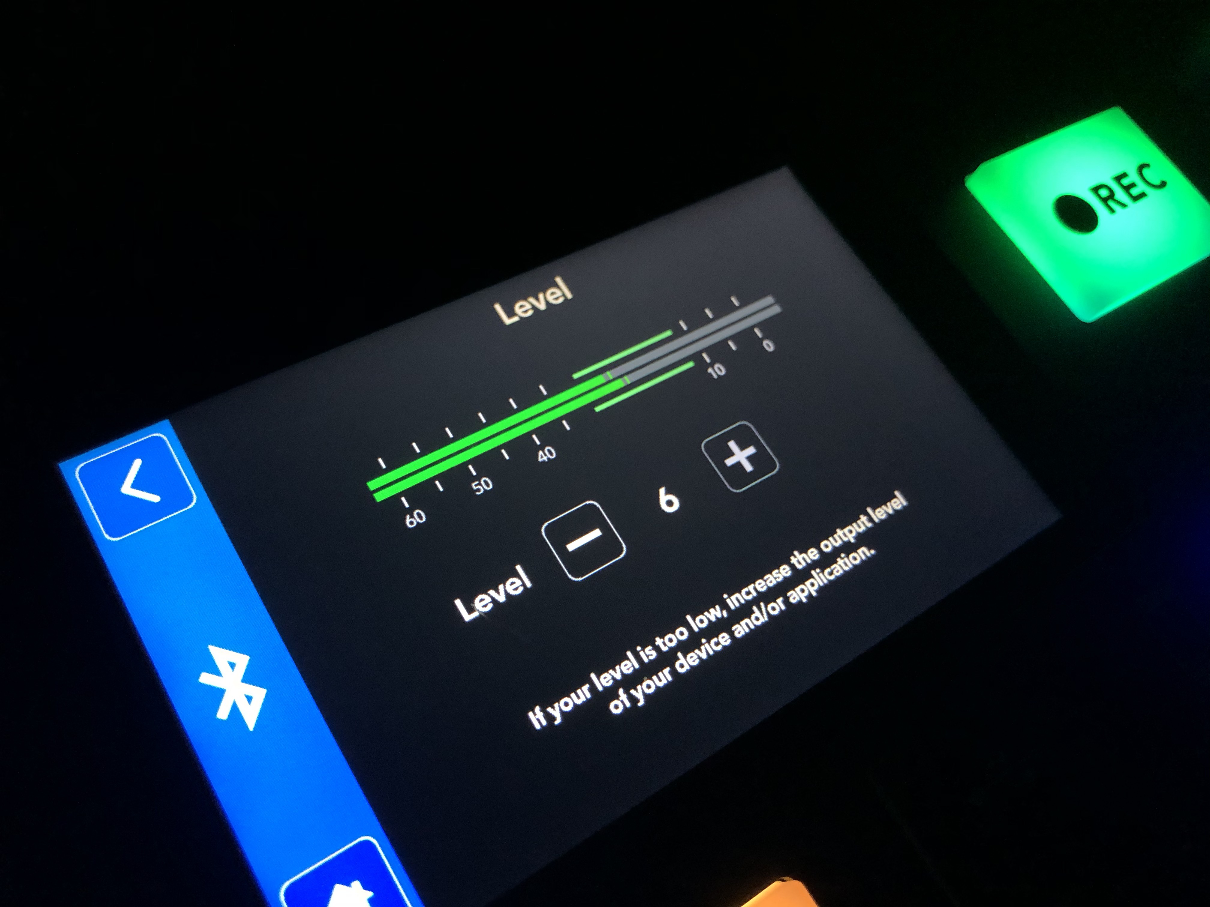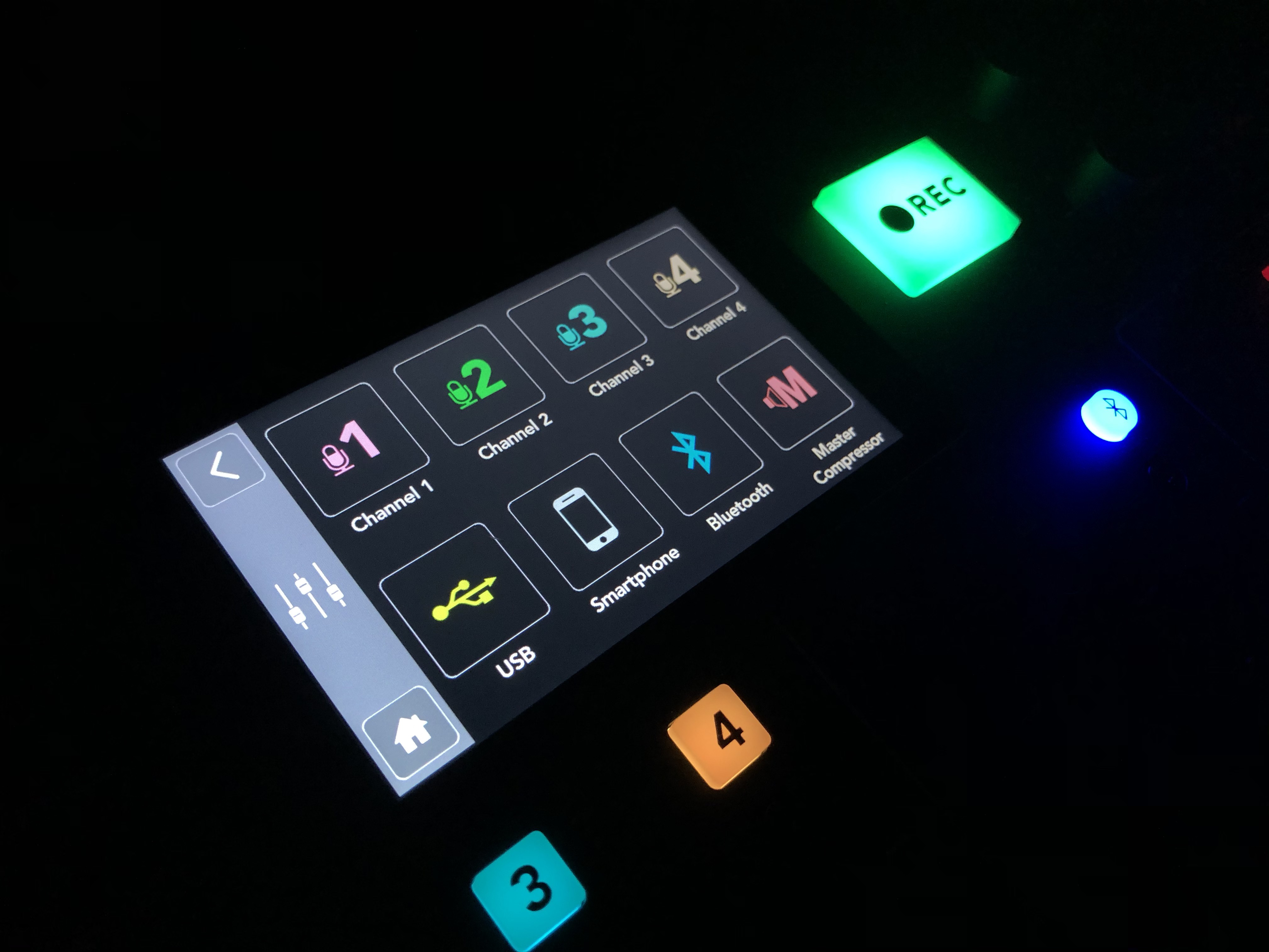 在Rode Caster Pro 那块分辨率很高的屏幕上,能清楚的看到:四个话筒、usb、手机、蓝牙和最终合成的音轨的电平显示。