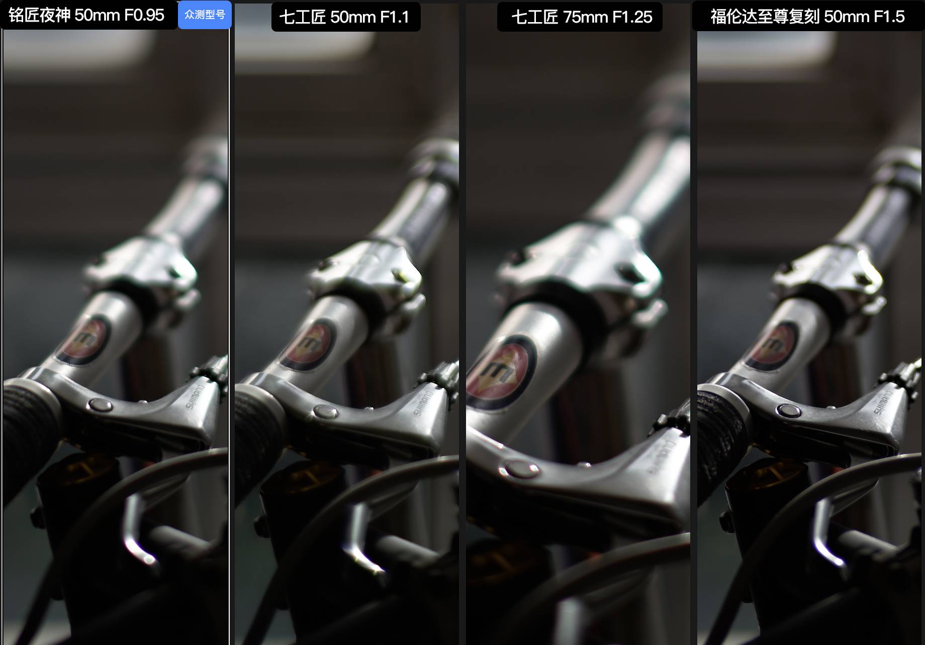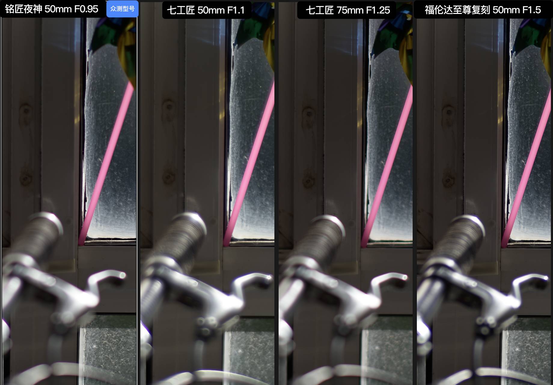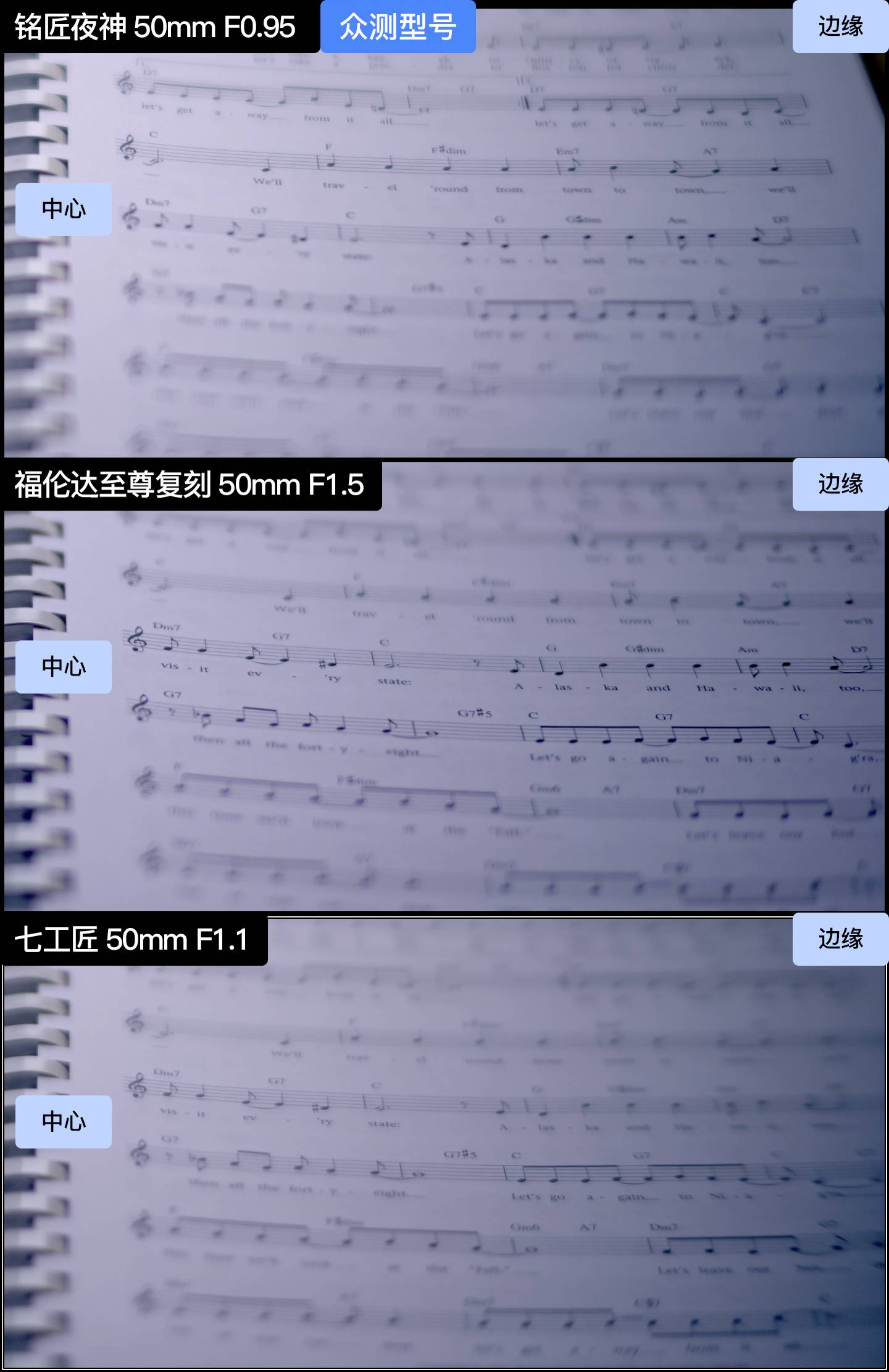 首先是场曲,截图左边是图像中心,右边是边缘。看图可知铭匠50夜神在全开光圈极浅的景深下像场也是很平的,相比而言福伦达至尊50mm复刻版在像场边缘有一点向焦平面靠拢,而七工匠50mm在全开光圈f1.1时,像场在边缘则是大幅度向焦平面倾斜了。