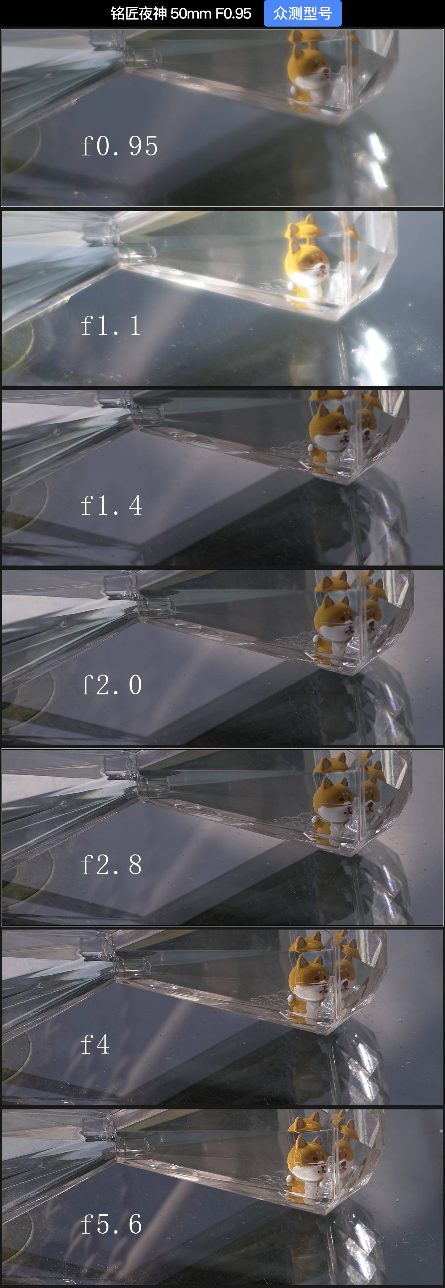 先说此次评测的铭匠夜神吧,f0.95全开时有大量未矫正的球差造成的对比度不足,收缩光圈有提升,但在缩到f2之前这种画质提升并不明显,继续收缩光圈到f4时得到最佳中心分辨率。