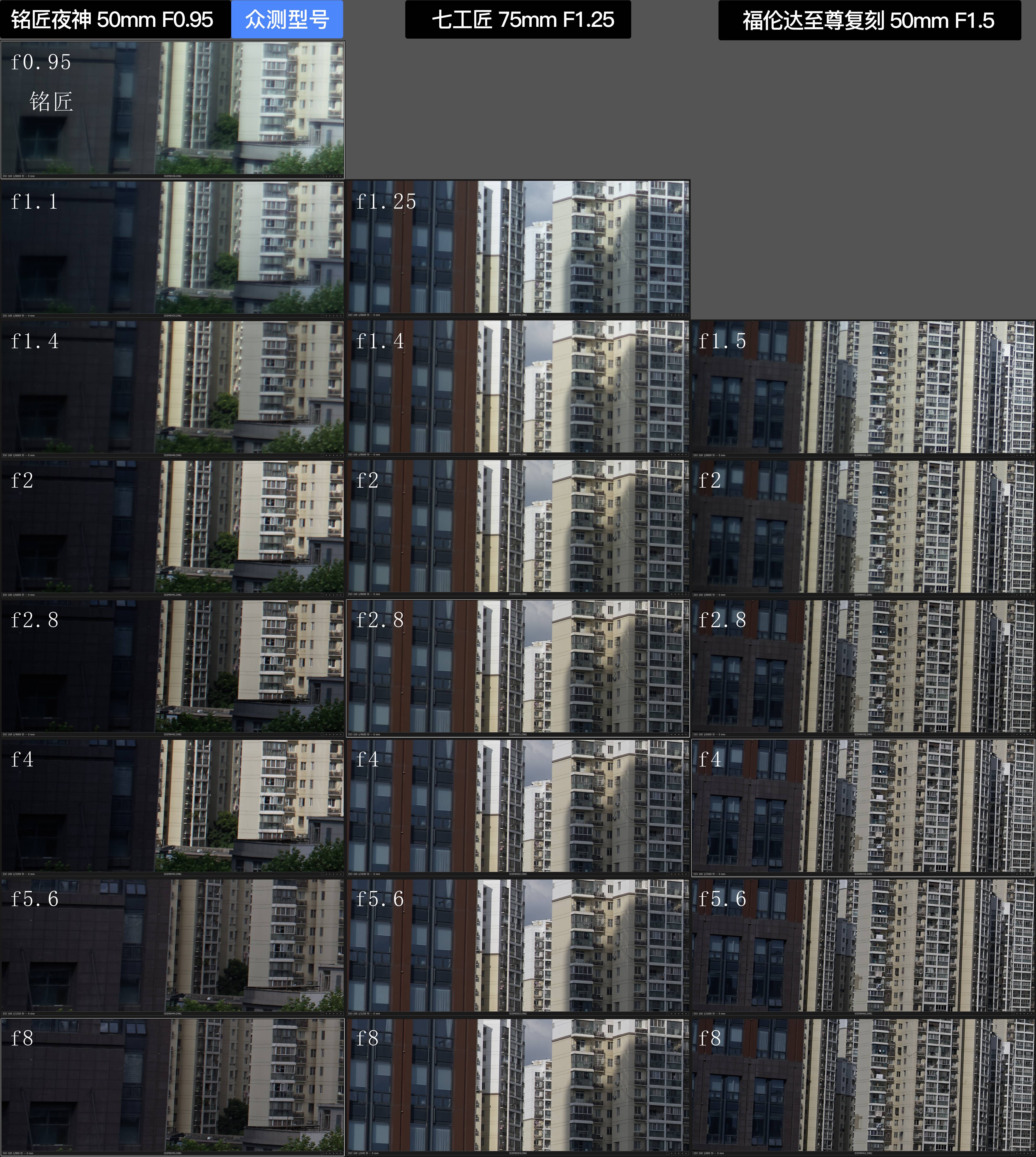 本轮测试,铭匠夜神光圈收缩到f2.8达到边缘画质最佳档位,但也随即衰落,并不会随着继续收缩光圈而提升边缘画质。且其分辨率峰值f2.8时,画质还略逊色于七工匠75mm f1.25全开边缘画质。所以本轮我们不再继续讨论本文的主角铭匠夜神,转而看看七工匠75mm和福伦达50mm的PK。