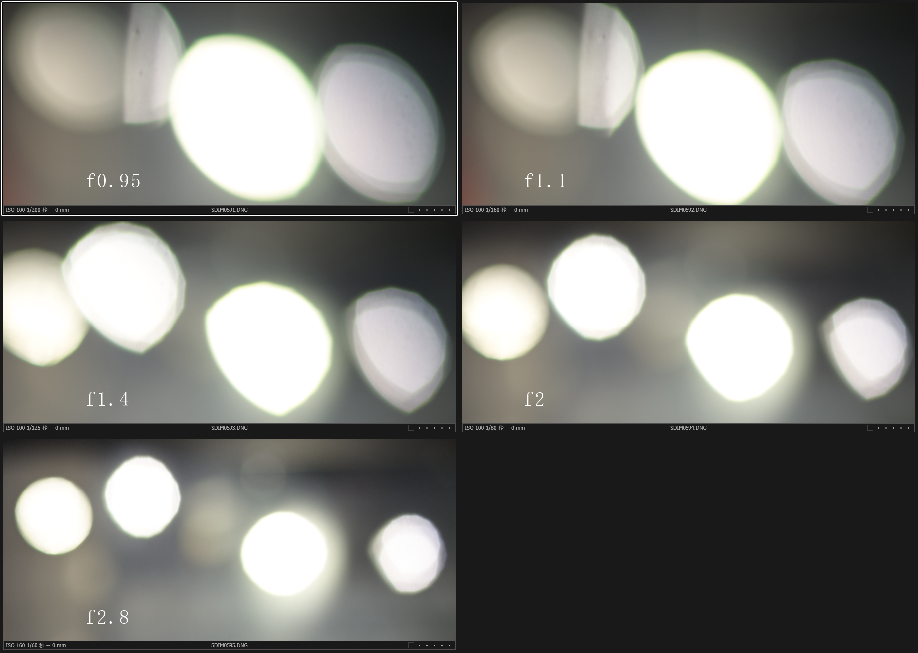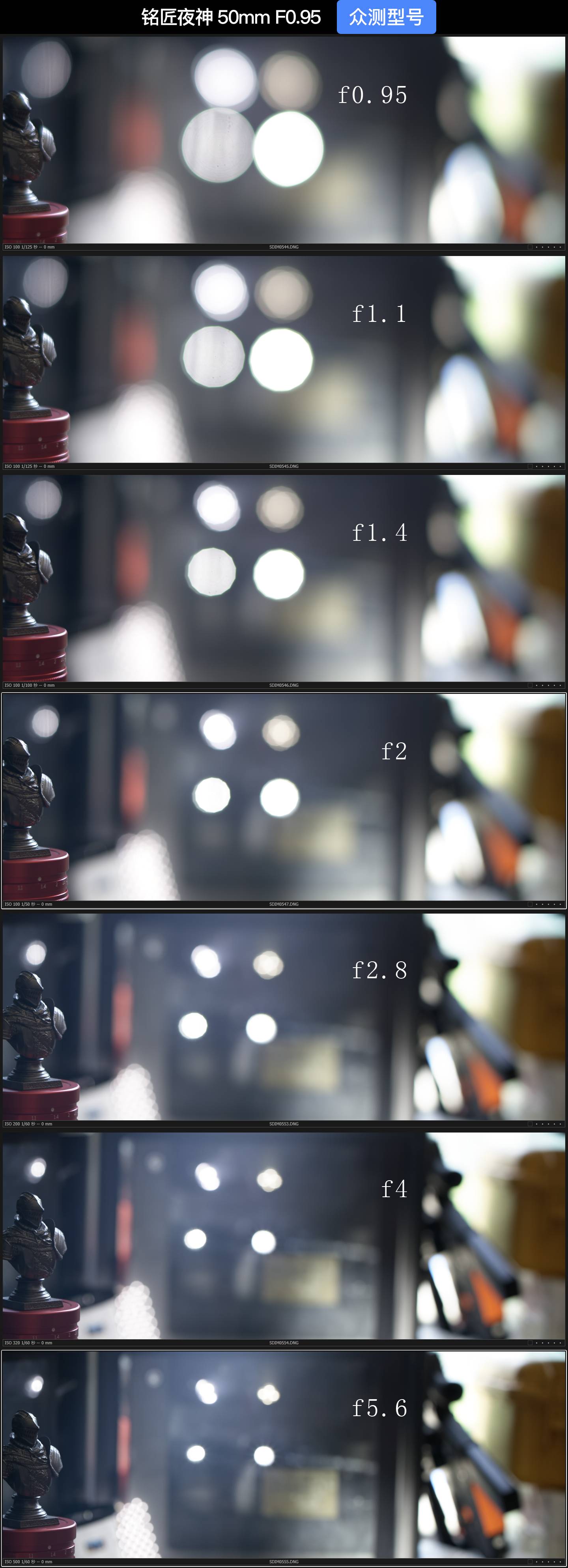 再来看第二张图铭匠夜神不同光圈的虚化对比。说明一下布光情况:中间四个圈,左上是一只直射镜头的三眼led手电,右上是一只直射镜头的四眼led手电,所以光斑有多个圆圈叠置。而左下光圈内部类似非球面镜头虚化中洋葱圈的成因是因为两片玻璃反射形成。