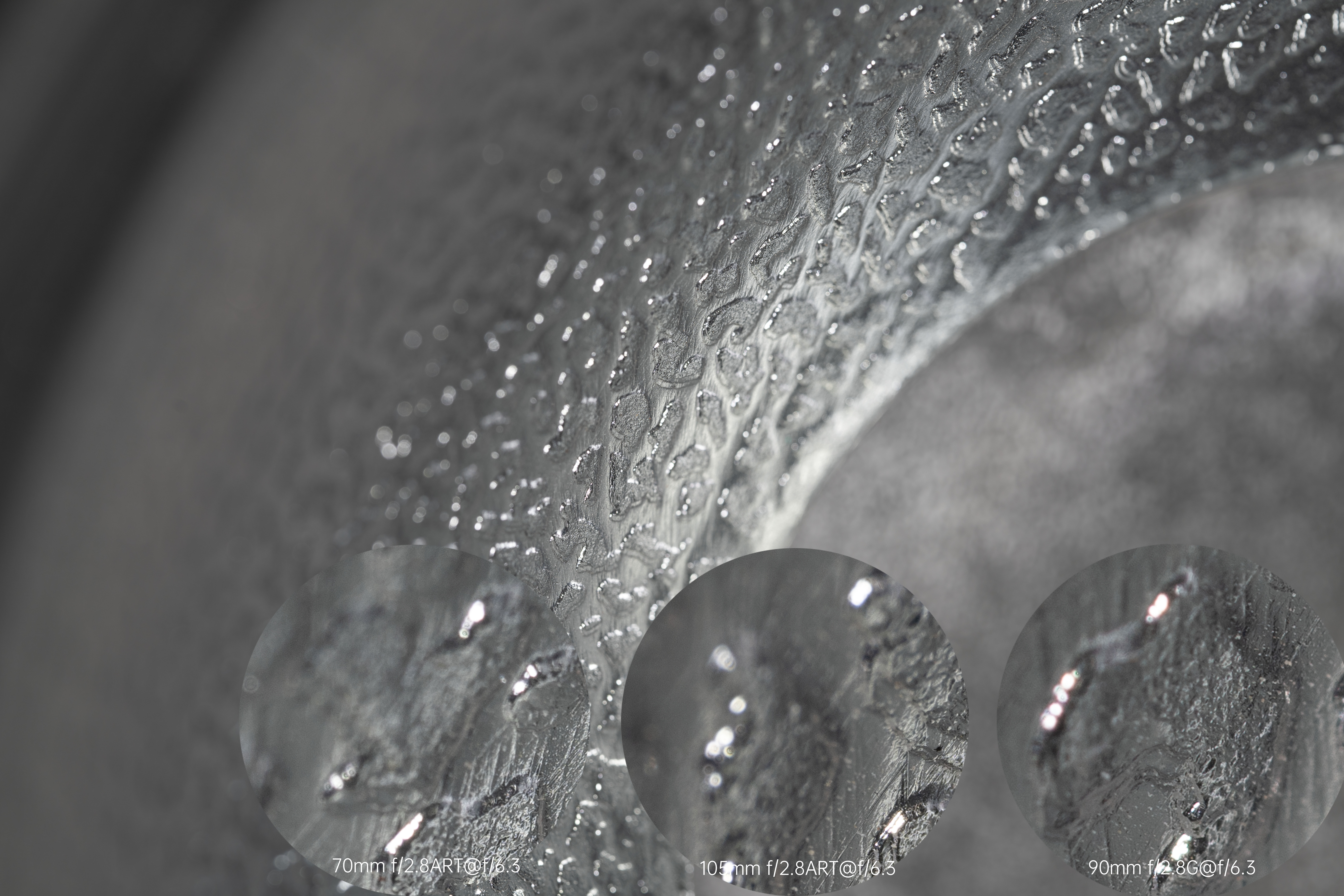 纹理细节方面在收缩两档光圈之后三支镜头差距不大,105 2.8ART看起来细节对比度更高一些。