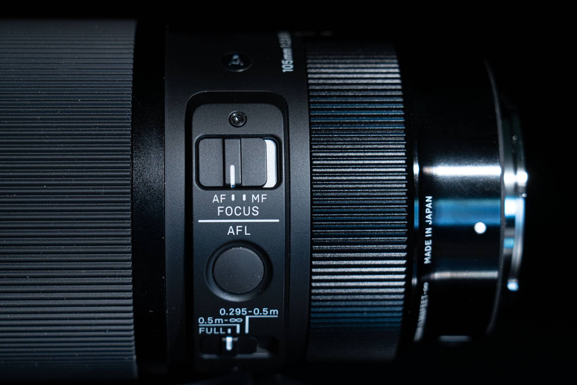 侧面,控制部分从上到下分别是A/M对焦切换、多功能按钮(可自定义,默认是对焦停止)和对焦限位器,限位器从0.5m开始分割为两档,方便拍微距和远摄的切换。