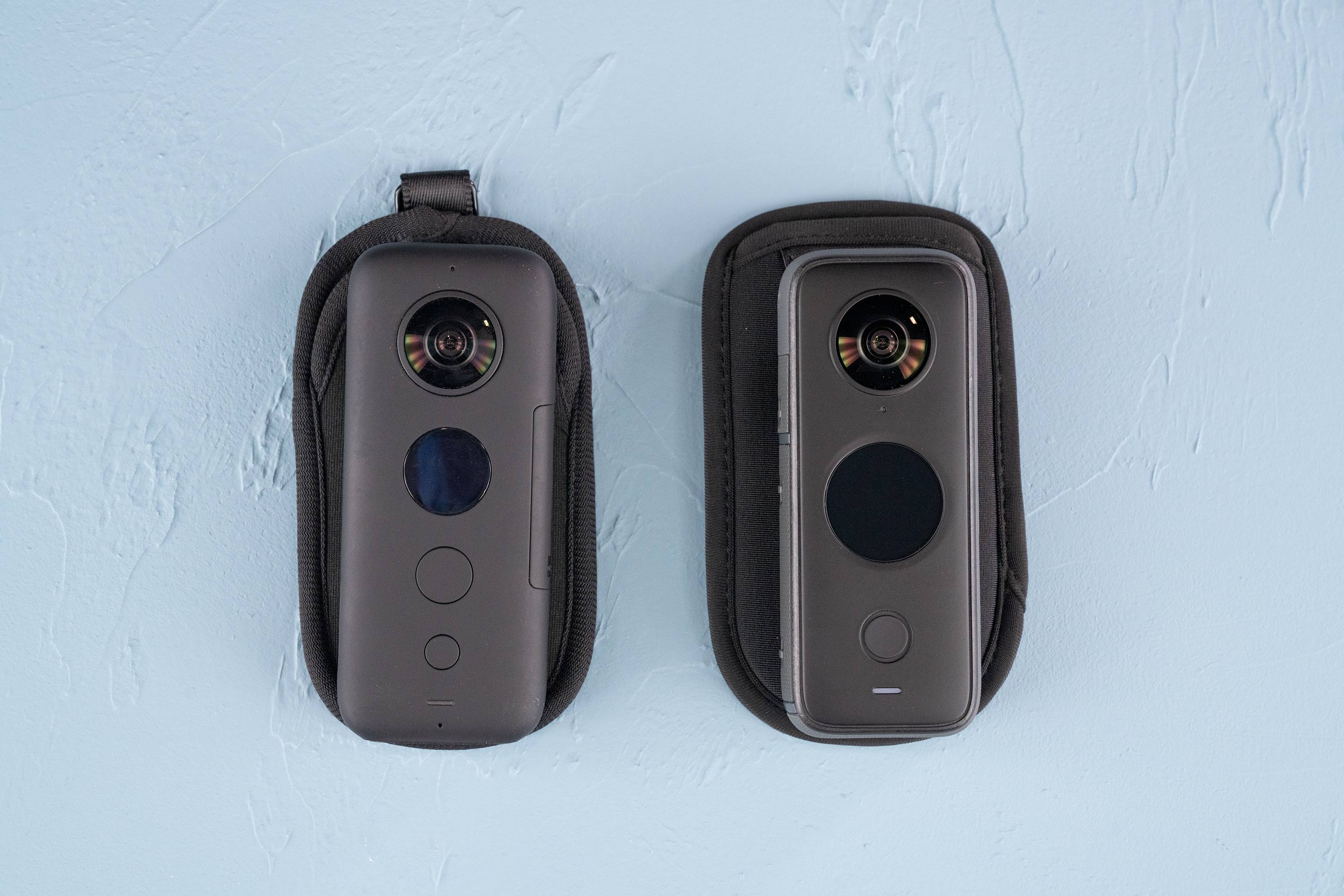 照片左边的是Insta360ONE X一代,右边上的是二代产品。正面看过去,二代的显示屏比一代的大了不少,按键也简化为一个。ONE X2这个显示屏不光是大了,内里也有乾坤。它不仅是高亮显示屏,在日光下可以清晰看到画面,还支持触摸功能,可在拍摄时全方面预览画面和触摸控制调节拍摄参数。在使用上解决了上一代没有手机辅助就没有办法预览或调参数等问题。