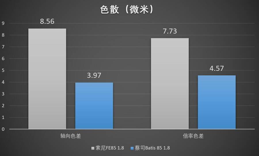 分为倍率色差(焦内色散)和轴向色差(焦外色散)两部分。计量各焦段下全画面色散的最大值,为其在像方焦平面(传感器平面)上的实际宽度。