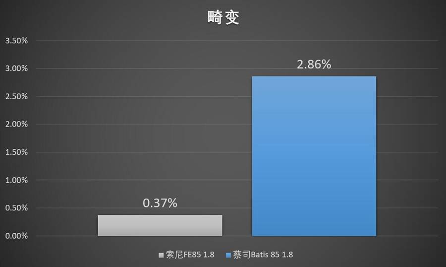 畸变可以说是Batis 85永恒的伤疤了,那个枕形畸变基本上令用过的人都难以忘怀。FE 85 1.8在这方面表现明显好太多,0.37%差不多就是横平竖直。