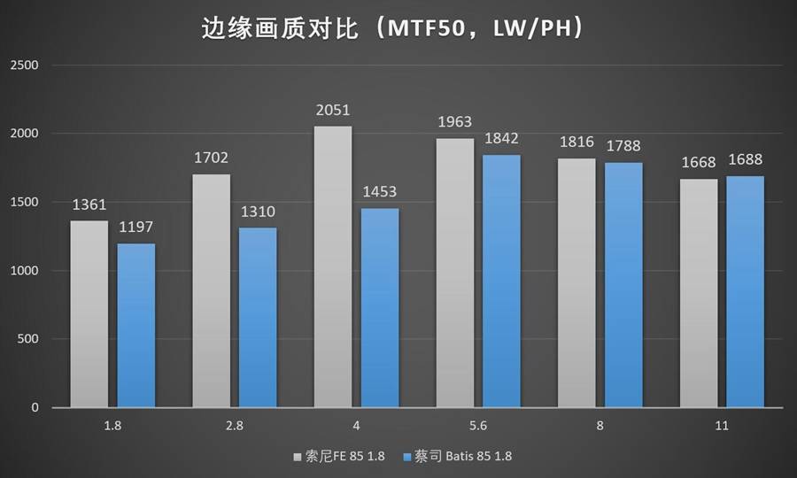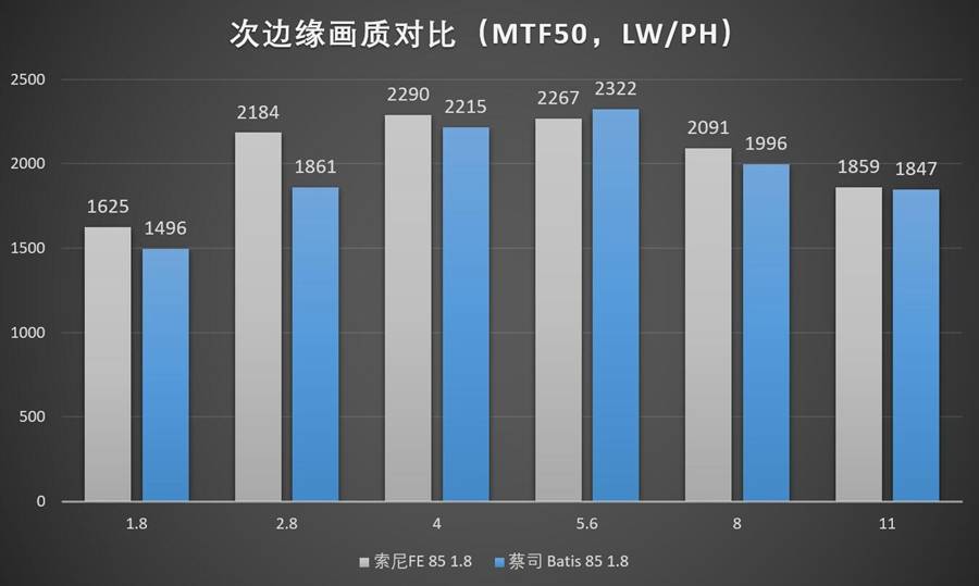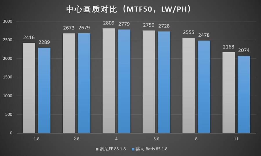 注:差不多2年以前我们做过Batis 85 1.8镜头的评测,但那时候评测项目刚刚起步,很多东西都在摸索当中没有完成标准化(比如当时没有对输出图片进行去锐化、去校正操作),跑出来的分数会存在一些偏差。如果两次Batis85测试的数据不一致,以本次测试为准。
