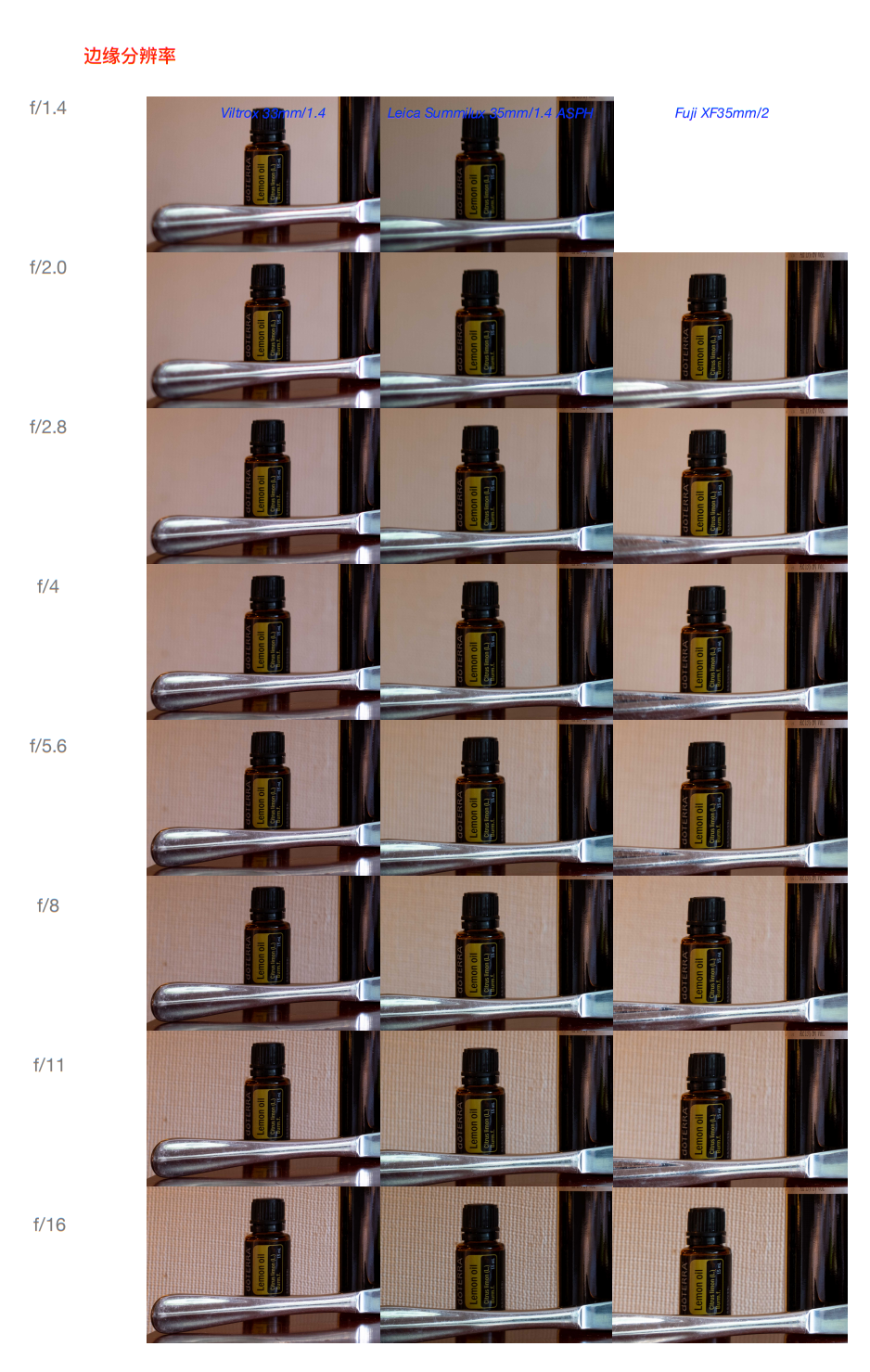 横评一下,在f/1.4徕卡略胜,并保持优势到f/2.8,唯卓仕其次,富土垫底(从f/2加入战局) ;从f/4开始,唯卓仕突然爆发,反超徕卡,并有肉眼可见的优势,此时富士已经与徕卡持平;在f/5.6以后,富士反超徕卡,与唯卓仕达到比肩的地步,排名稳定在唯卓仕,富士并列第一,徕卡垫底,直到f/16。