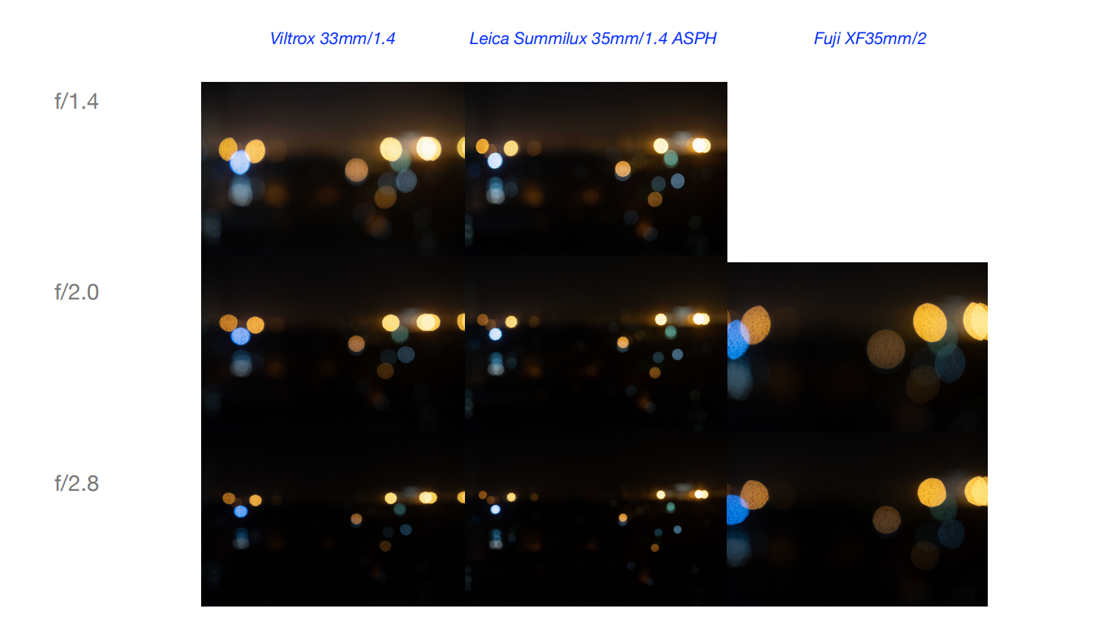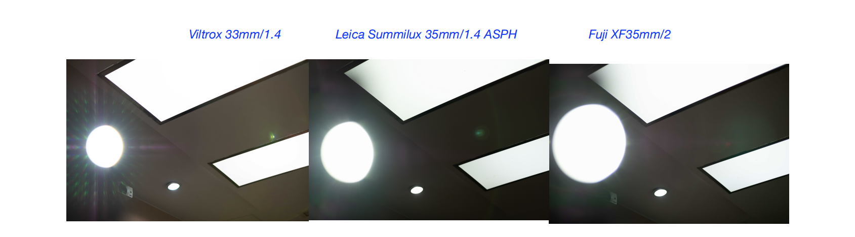 因为最近对焦距离不同,全开光圈的光斑大小明显不同,富士无疑是最大的,唯卓仕次之,徕卡最小。三款都没有明显的洋葱圈现象,口径蚀方面,徕卡控制的最好,富士和唯卓仕半斤八两,边缘都有明显的猫眼征。缩小一档光圈,富士的光斑明显不圆了,甚至都不是规则的多边形,应该是光圈叶片少的缘故,有些影响感观。徕卡和唯卓仕则呈现规则的多边形,表现中规中矩,都不算好看。