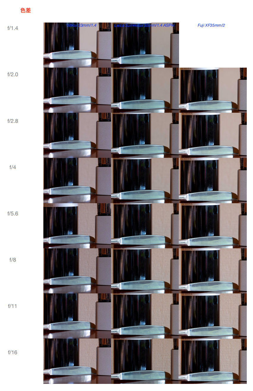 下面来到此次评测我比较关心的方面:色差。这方面索质充分体现镜头的镀膜水平,这是国产厂商一直相对薄弱的环节,就像中药里面的秘方,各家都有自己的高招。徕卡一直没有在镀膜方面做过多宣传,三大镀膜技术也没有徕卡的身影,但是从金属刀具的边缘来看,徕卡从光圈全开起,就没有明显紫边,真的是厉害。富士有SUPER EBC镀膜加持,基本与徕卡同一水平。唯卓仕这次并没有明显的突破,全开光圈紫边感人,直到收缩到f/4才完全消除。