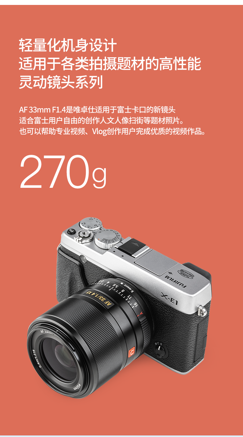 而今天的主角唯卓仕33/1.4,从发布之初就让人眼前一亮。无反卡口,自动对焦镜头,这两个词的组合简直是让人兴奋。尤其作为一个富士XF卡口用户,除了原厂镜头和转接外,几乎没有什么选择余地。连适马都没有拿到卡口协议,不知道唯卓仕是怎么做到的,反向研发还是什么,总之干的漂亮。那么下一个问题就来了,这枚镜头的素质如何,是否能是一个破局者?