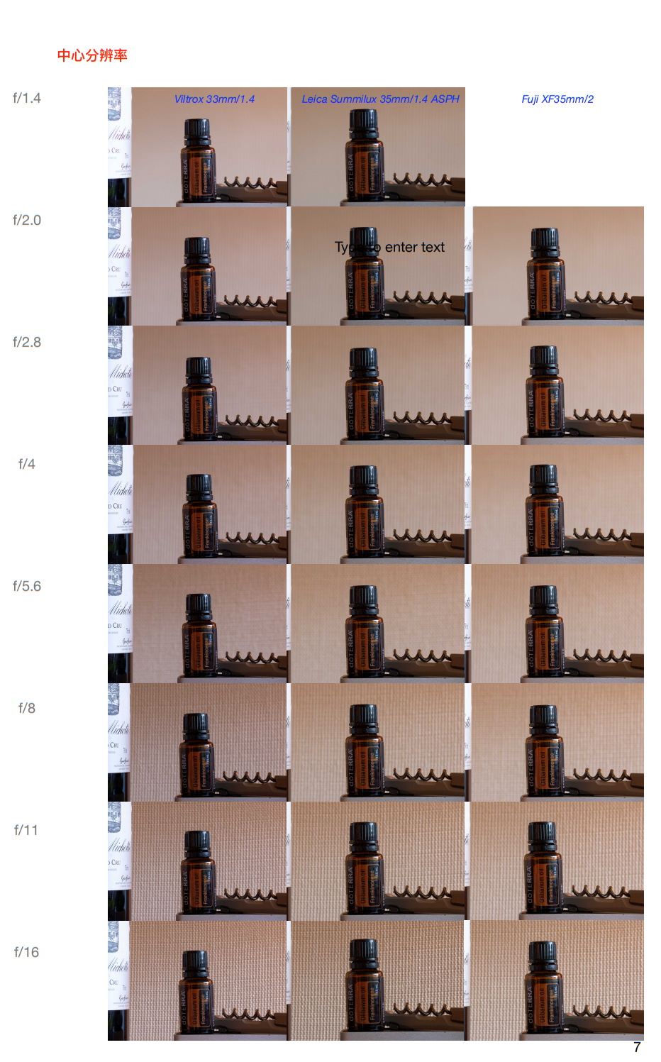 唯卓仕33/1 4全开光圈差强人意,比徕卡稍软而已,收缩到f/2.8基本和徕卡持平,到了f/4,画质有一个质的飞跃,骤然达到最佳光圈,维持高水平一直到f/11。富士35/2从f/2起跳,全开稍软,收缩光圈后成像水平稳步提升,f/5.6来到最佳, 在f/16会有一个下降。