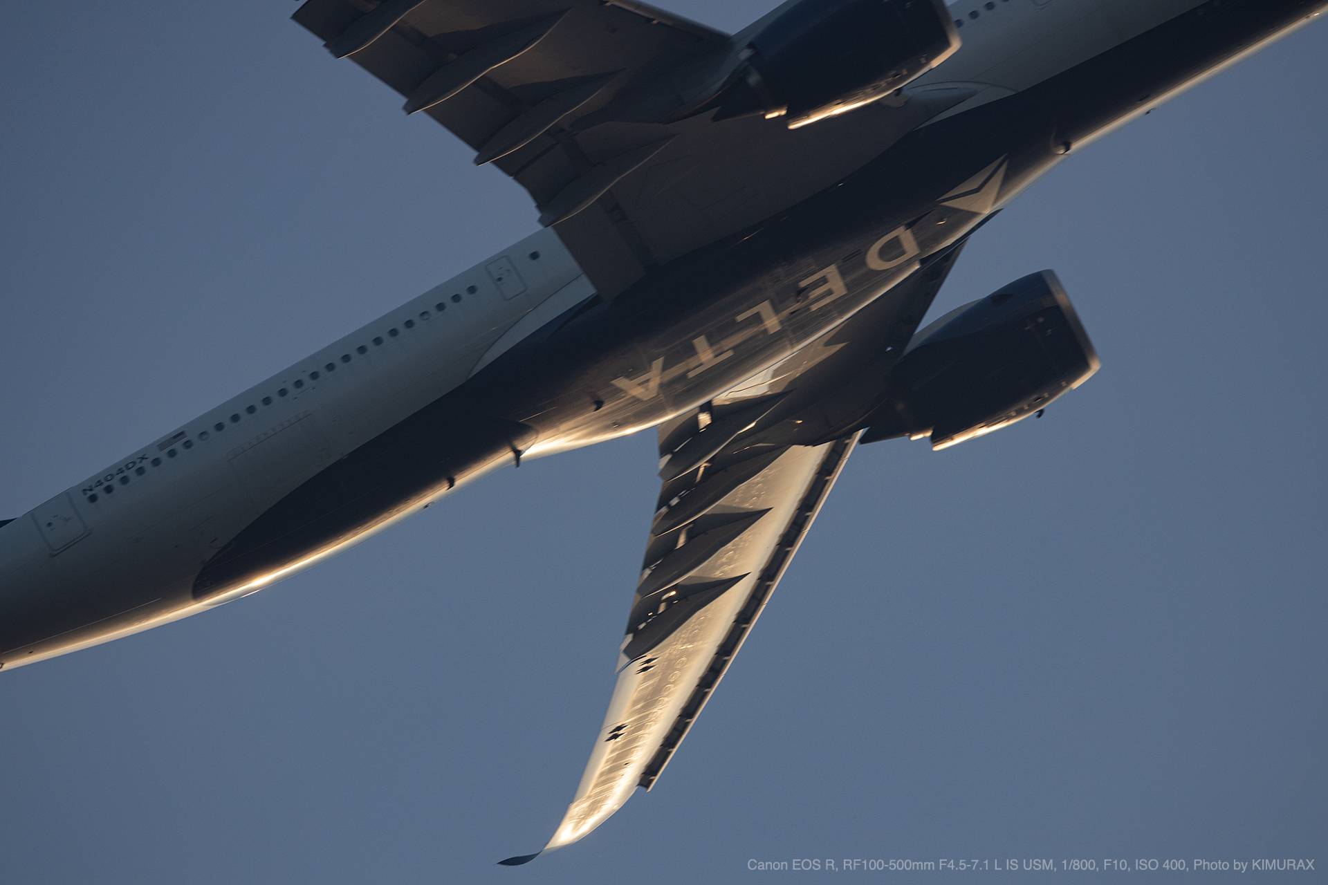这次使用的相机是已经有很多人使用的EOS R。即使没有机身防抖,通过镜头的光学IS组件也能得到约5级的修正效果,如您所见完全没有模糊。顺便一提,使用具有机身防抖的R5和R6的组合可以达到约6级防抖。AF虽然不及最新的R5和R6那么快,但是瞬间经过上空的飞机也迅速地对上焦了。