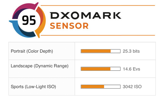 从单个指标来看,EOS R5传感器在色彩深度方面稍显不足,25.3的成绩低于Z 7和S1R,这两款竞品在区分色彩方面比R5更好。不过EOS R5在传感器的最大动态范围上取得了实质性的提升,在ISO 50/100处,其最大动态范围为14.6EV,在ISO 400处仍能保持近14档(13.8 EV)的动态范围,与Z 7互有胜负,强于S1R。低光ISO方面, EOS R5竞争力相当高,30dB时为ISO 3042,介于Z 7和S1R之间。