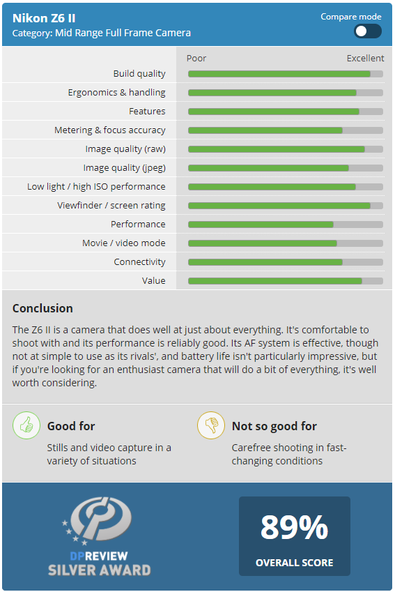 DPReview发布尼康Z 6II评测,总评89%银奖推荐