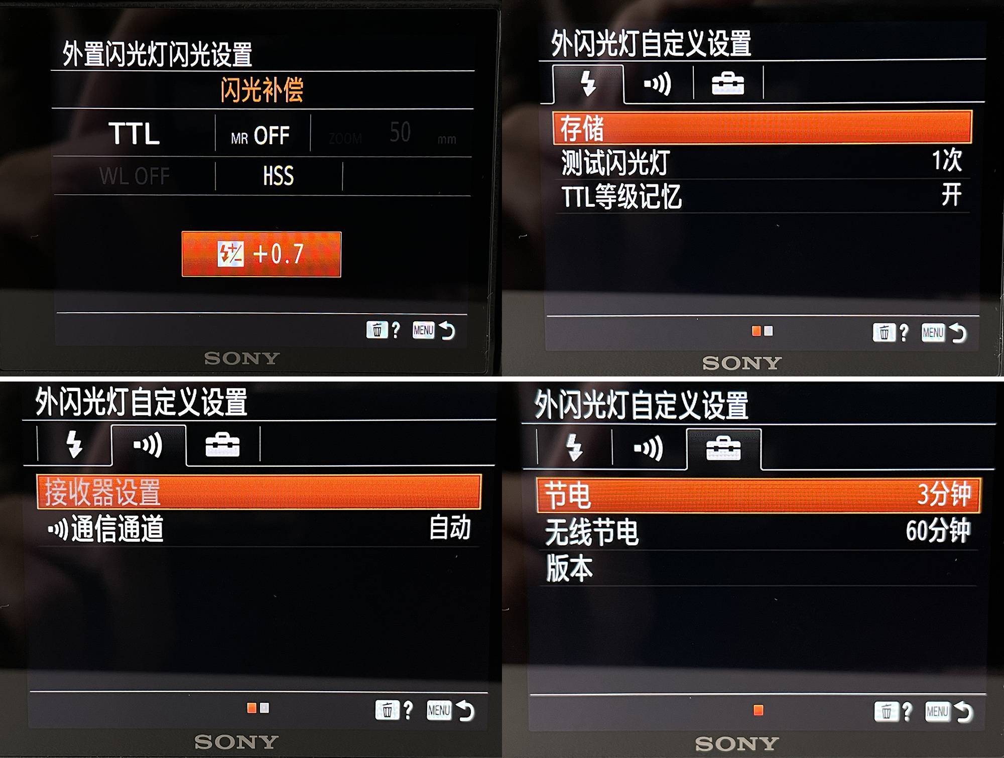操作界面方面,在相机菜单中提供了非常多的可调整功能(某些机型需要固件升级后支持)。比如灯光输出功率的补偿,无线引闪控制,闪光灯节电设置等。