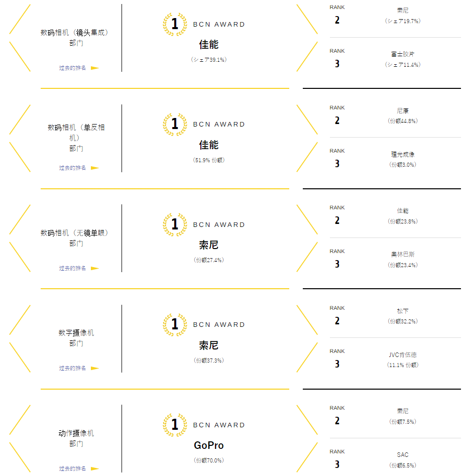 近日BCN AWARD公布了2020全年日本相机的市场份额情况排名,结果根据部分日本零售商的销量数据而得出,在2020年中佳能索尼成为了最大赢家,分别斩获了多项第一,具体名次如下:固定镜头相机:1、 佳能2、 索尼3、 富士 单反相机:1、 佳能2、 尼康3、 宾得 无反相机:1、 索尼2、 佳能3、 奥林巴斯 摄像机:1、 索尼2、 松下3、 JVC 运动相机:1、 GoPro2、 索尼3、 SAC