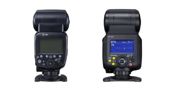 首先,SPEEDLITE EL-1(右)的键位设计和SPEEDLITE 600EX II-RT(左)完全不同,操控更加方便和直观,尤其是拨盘中间的操纵杆设计,让设置更加快速,可以迅速设置变焦、无线联动、补偿设置与闪光模式切换。