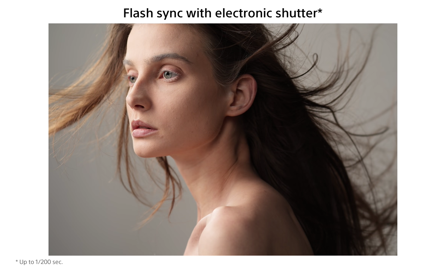同样因为刷新速度提升,电子快门首次支持闪光灯拍摄。使用电子快门时,在设置中可以开启显示闪光灯预览功能,在取景器和显示屏上可以直接预览使用闪光灯的拍摄效果。使用闪光灯时最高的同步速度为1/200s(APS-C为1/250s),实现闪光灯的全功率输出,最高连拍速度保持在30fps。电子快门唯一的缺憾是只能无线引闪,不能使用机身上的闪光灯同步端子,只有机械快门可以。
