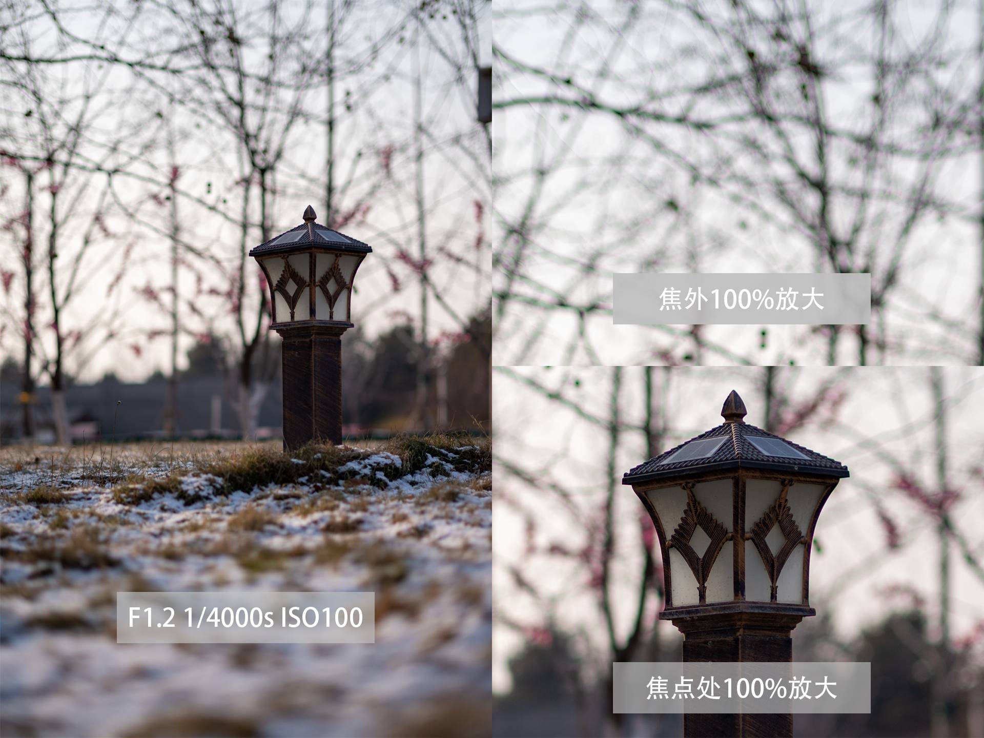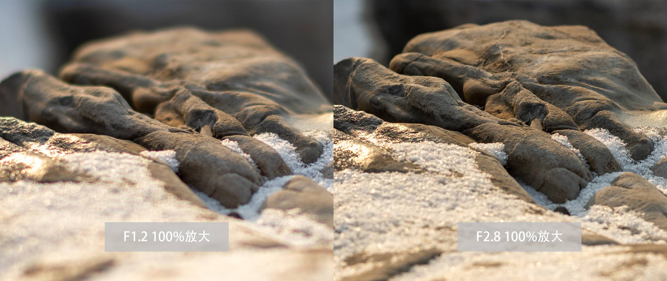 这一组图片也为逆光拍摄,在F1.2时我们可以看到雪花上有较多色散出现,当光圈缩小至F2.8时雪花上的色散减少许多。