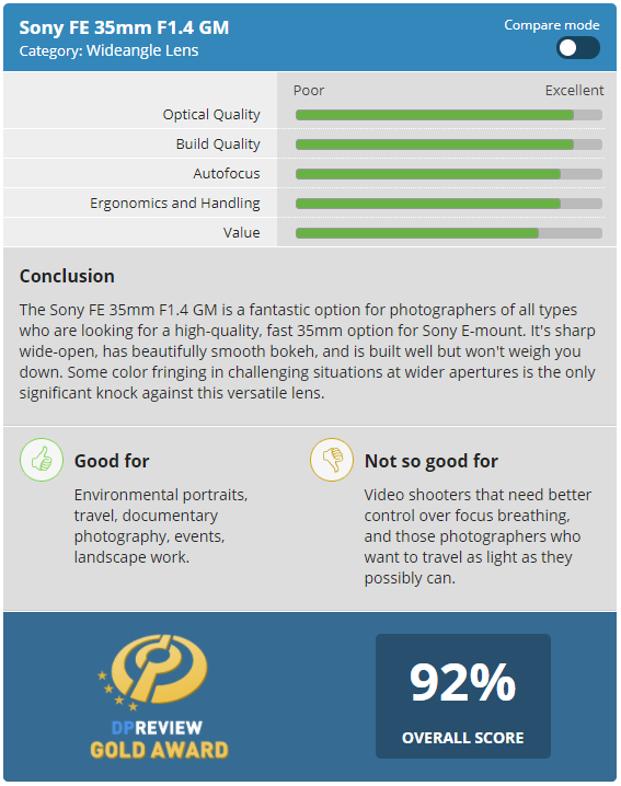 索尼FE 35/1.4 GM是所有寻求高质量35mm大光圈镜头的各种类型摄影师的一个梦幻选择,其有锐利的全开画质,有漂亮的焦外,并且做工又好又轻,不会拖累你。光圈全开时在具有挑战性的环境下边缘色散是这款多功能定焦镜头的唯一重大问题。对于环境人像、旅行、风光等题材的摄影师来说这款镜头很合适,但呼吸效应会对视频用户有些困扰。