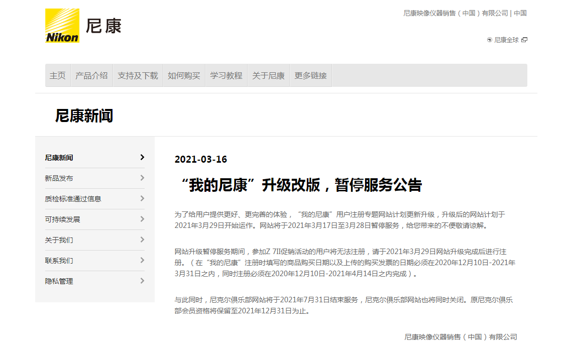 尼康计划将“尼克尔俱乐部”及原“我的尼康”网站整合升级至新“我的尼康”平台,现“尼克尔俱乐部”网站将于2021年7月31日结束服务。