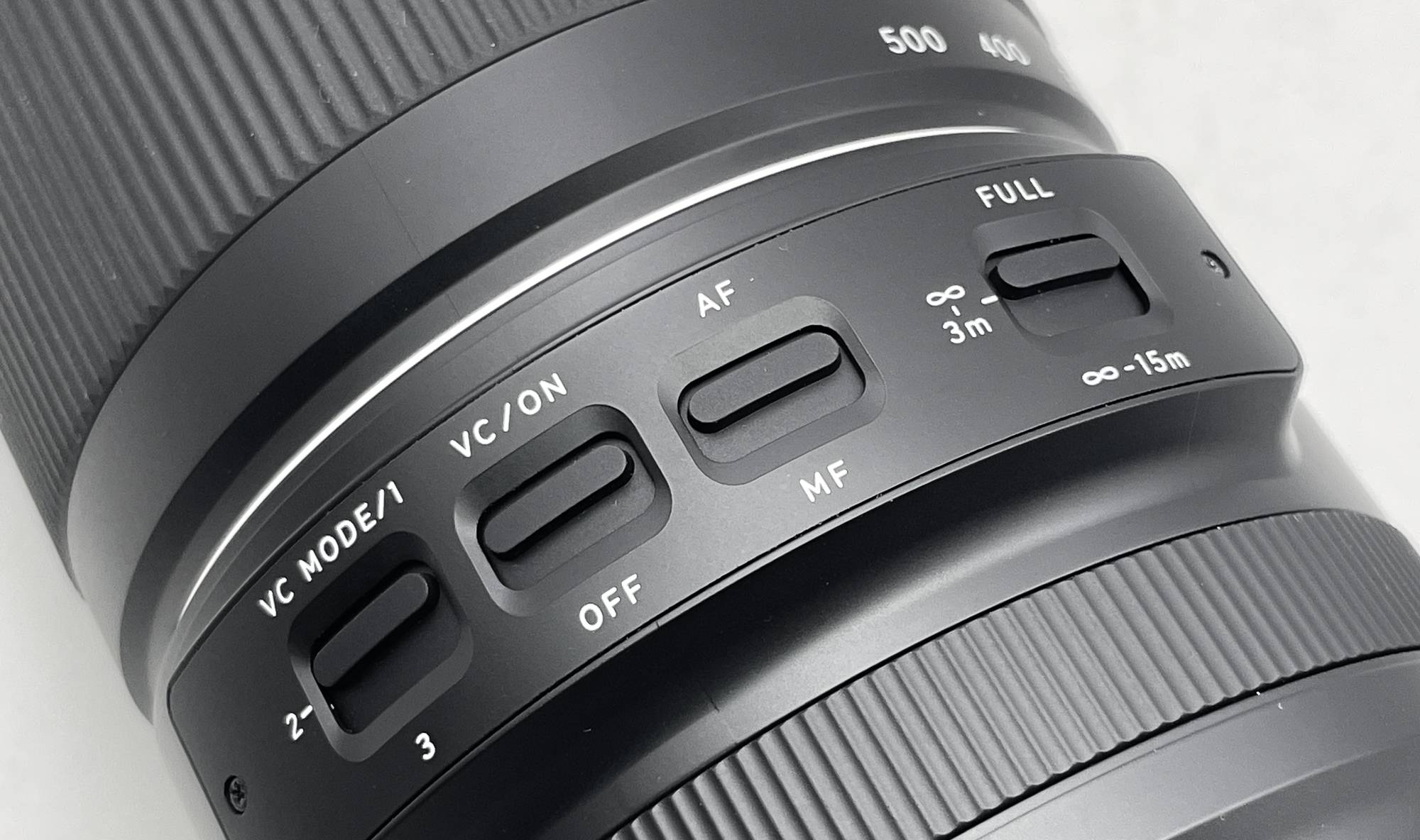 镜身中部有AF/MF对焦模式切换、VC防抖开关、防抖模式选择和对焦限制开关。150-500mm镜头有3种防抖模式,分别是标准、平移专用、成像优先。