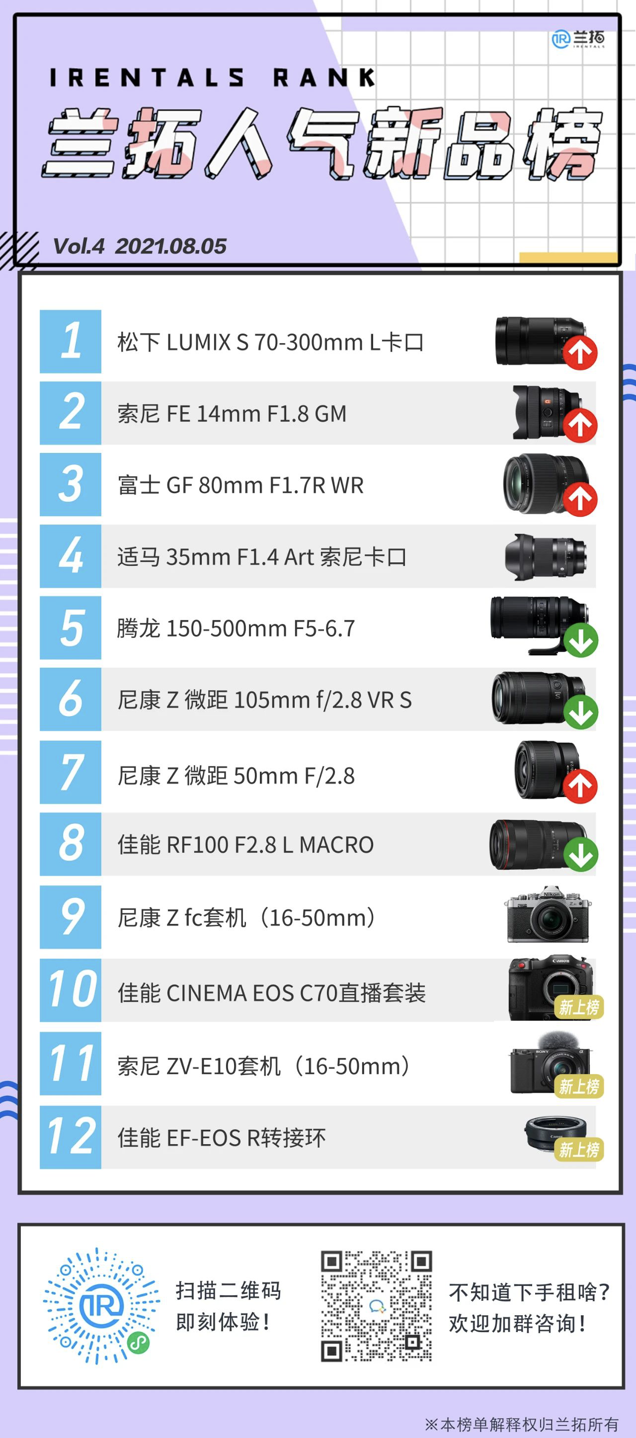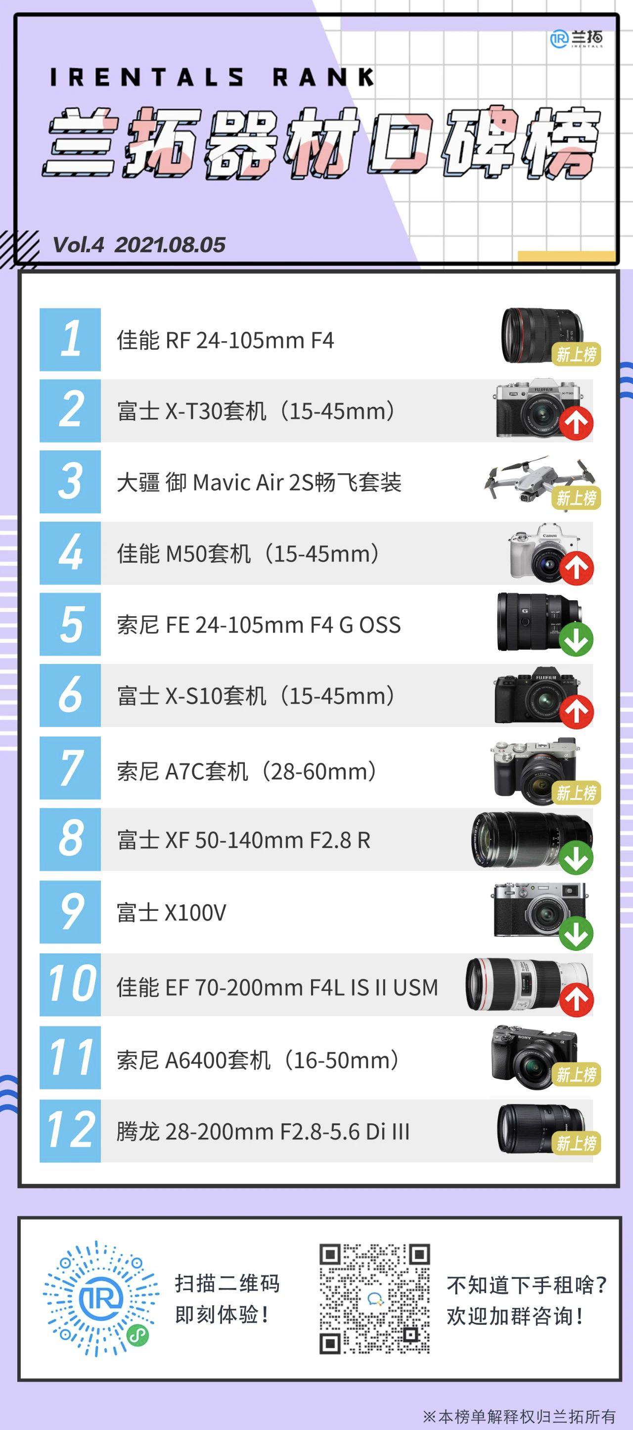今年各家新品如同雨后春笋般涌出,随着时间的变化大家的租赁风向也会产生变化。未来还会有更多器材出现在我们的榜单中,如果大家对器材选择有任何疑问,欢迎扫描图中的二维码加入器材交流群!耐心客服小姐姐将一一解答。