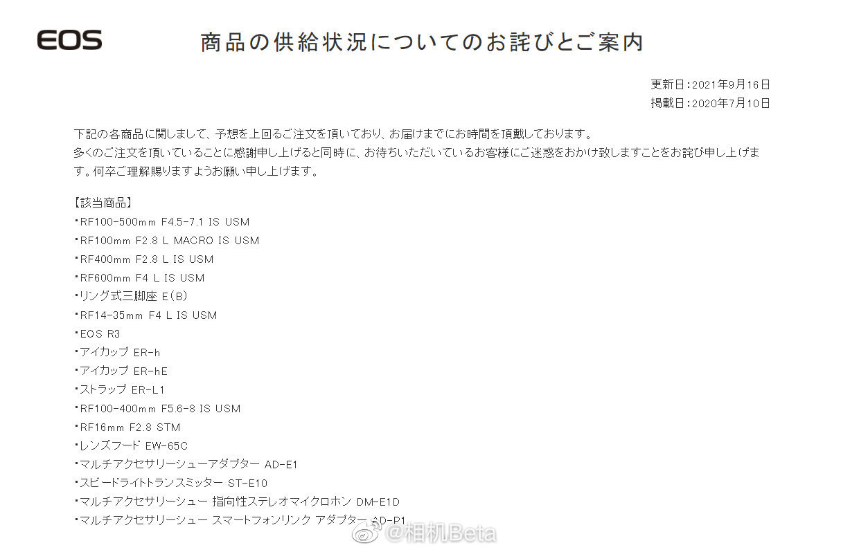 【佳能日本官网:包括EOS R3在内多款新品供不应求!】