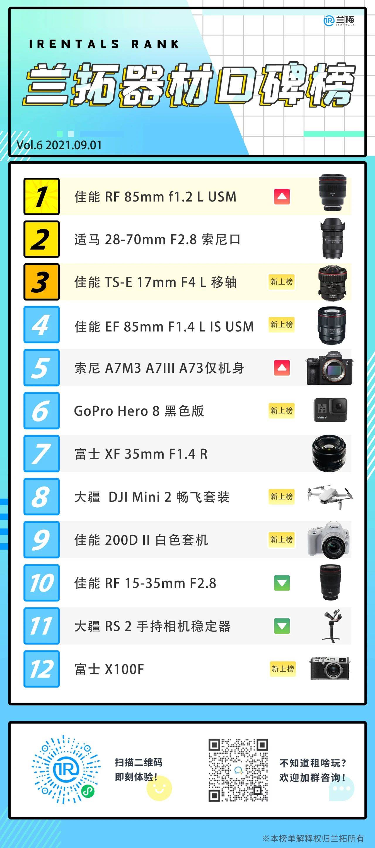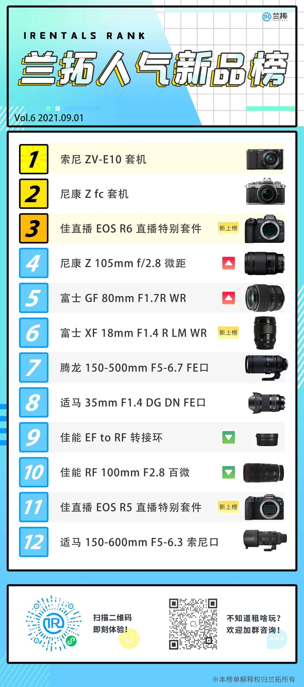今年各家新品如同雨后春笋般涌出,随着时间的变化大家的租赁风向也会产生变化。未来还会有更多器材出现在我们的榜单中,如果大家对器材选择有任何疑问,欢迎扫描图中的二维码加入器材交流群!耐心客服小姐姐将一一解答。