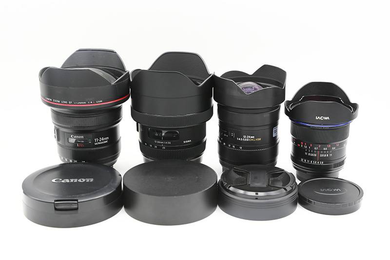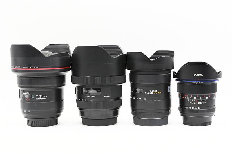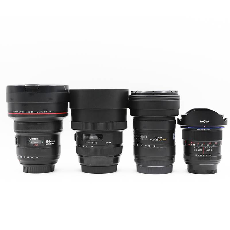 这几个镜头摆在一起看一看,三支变焦镜头的总携带长度都差不多,身为定焦的老蛙12/2.8明显小一圈。不过如果算总体积,佳能11-24和适马12-24ART由于过于“肥胖”,还是比右边的两支镜头大了不少,而且握在手上十分沉重。