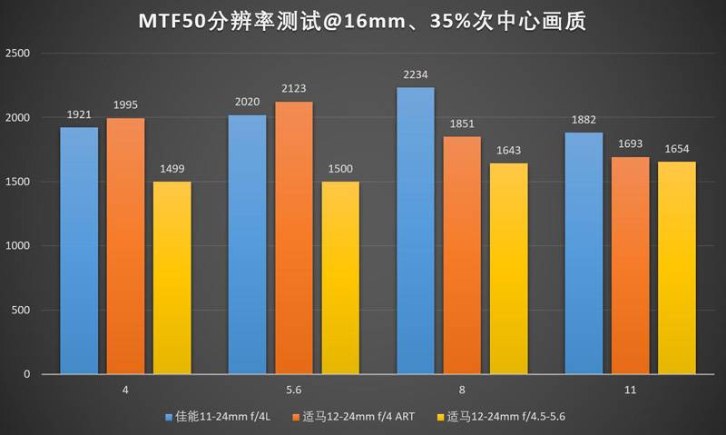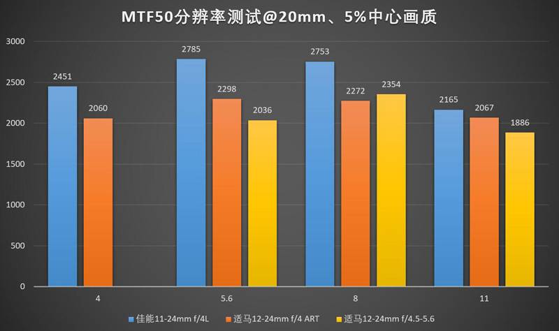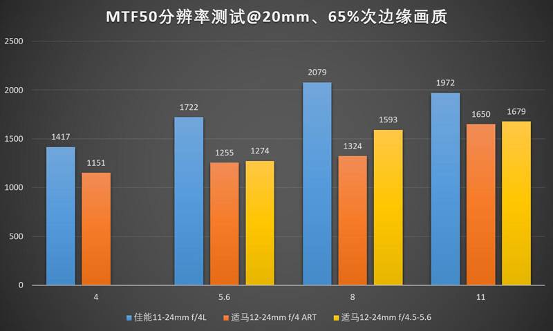 在这个焦距下佳能11-24/4L和适马12-24/4ART的表现几乎是持平的(中心稍差一点,边缘反超),甚至连老态龙钟的适马12-24II,其表现也绝对不是说不过去的水准。三支镜头的最佳光圈都在f/5.6左右。需要注意的是这里适马12-24II的f/4,实际光圈是f/5.0,为方便比较,放在了f/4的柱状图里。
