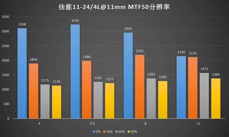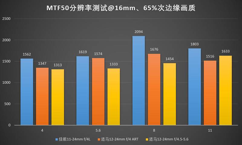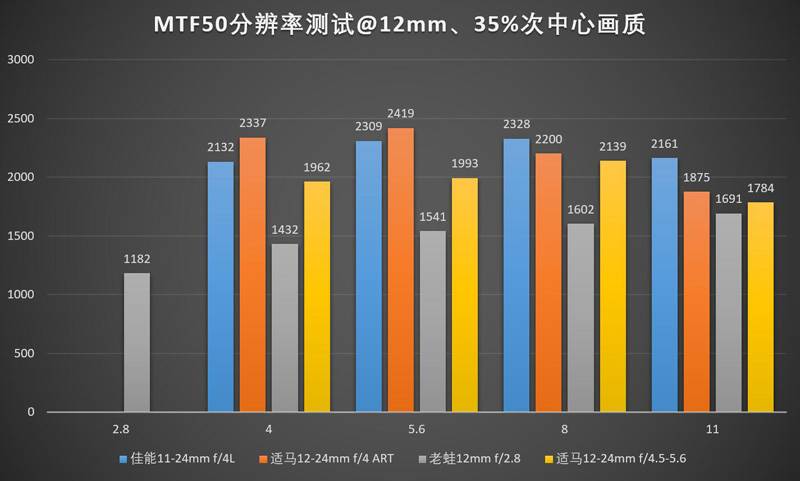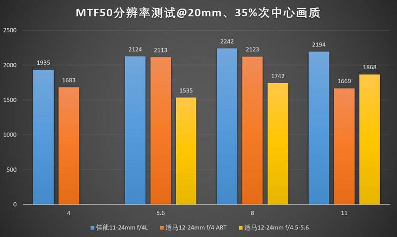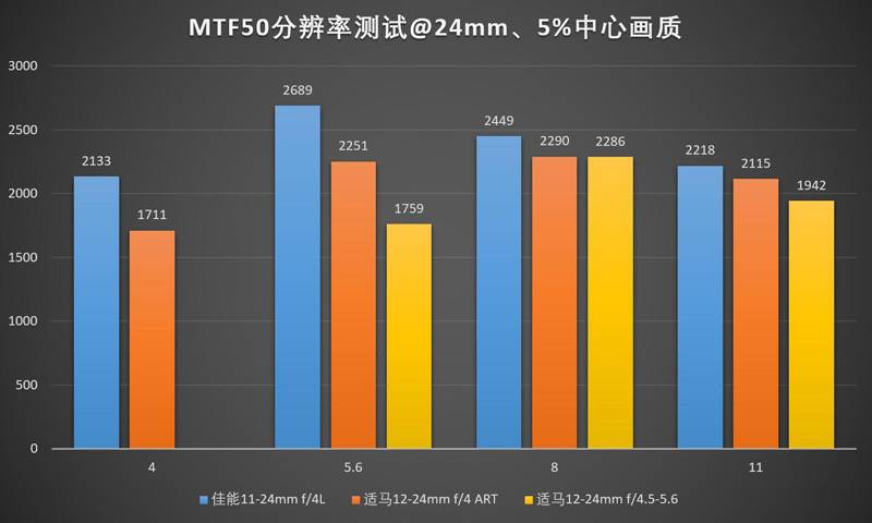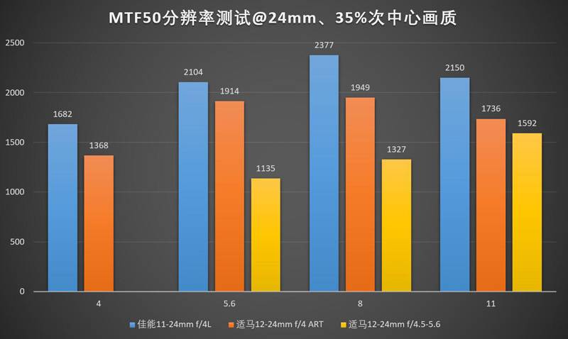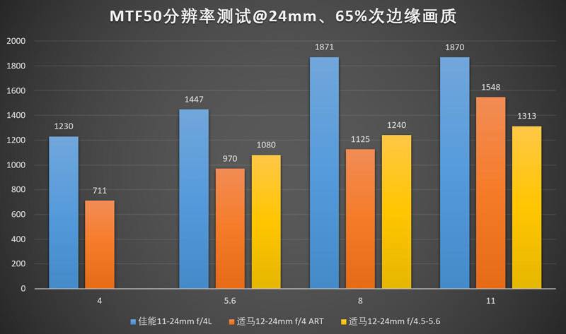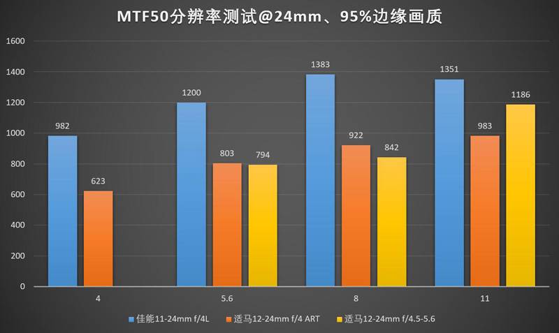 24mm下佳能11-24的领先优势进一步扩大,适马12-24ART则堕落到了一个跟老款12-24II区别不大的水平。11-24的中心最佳光圈是f/5.6,边缘最佳光圈是f/8,实际上用f/6.3会比较均衡?(笑)。