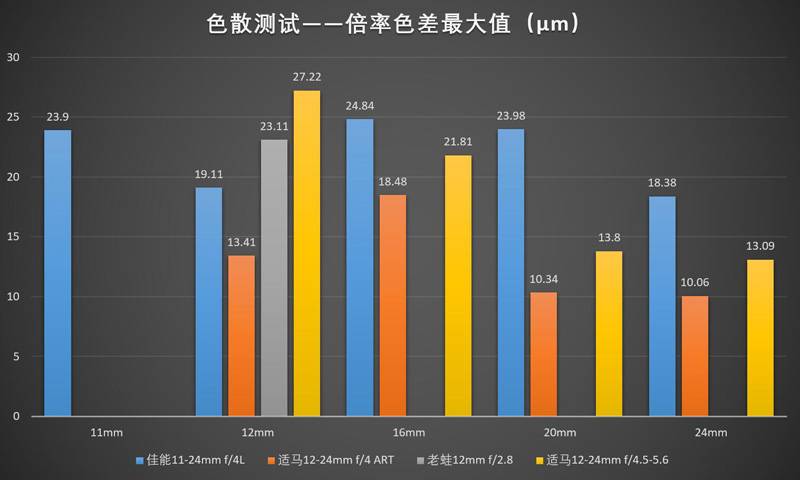 倍率色差的特性之一就是难以通过收缩光圈消除(收缩光圈不会改变像的大小),所以大家就不用纠结测这个表用的是多大光圈了……而且介于上面提到的原因(1/β较大),其色散控制不可能像中焦堆料镜头一样控制到3~5μm的极端优秀水准,能压到10μm就已经算极好水准了(佳能新大三元16-35L III都没做到这个水平)。看测试结果的话,色散控制最好的是适马12-24ART,尤其是在稍长一点的焦距上,已经相当接近10μm的极优秀基准线,跟它长焦端的崩溃解析力形成了鲜明对比(还真是特喵的矛盾啊)。其次是老适马12-24(这个特性也是家传的?),长焦端做到了13μm的不错水准,但是……广角端色散反而最差,喂,你这个特性,要你何用。。。