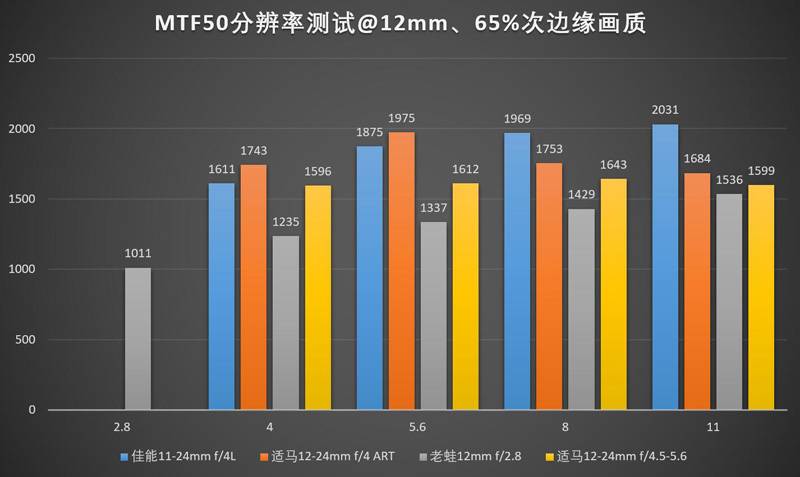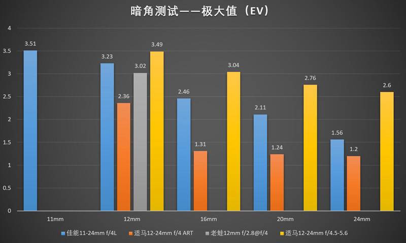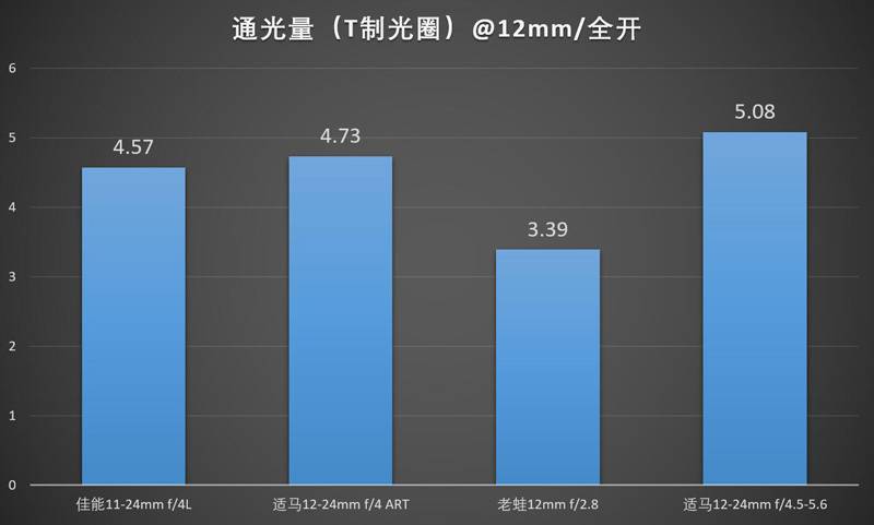 光通量(T制光圈)方面,本身f/制光圈就大一档的老蛙12/2.8取得了最好的成绩。但是,T3.39如果缩小一档的话就是T4.81,实际上如果大家都做f/4,国产镜头的镜片通光率还是会差一点,只不过差得不夸张了。f/4的两支镜头里佳能11-24比适马12-24ART在通光上好了一点点,标称光圈f/4.5的老适马12-24II在这个测试当中处于垫底水平。