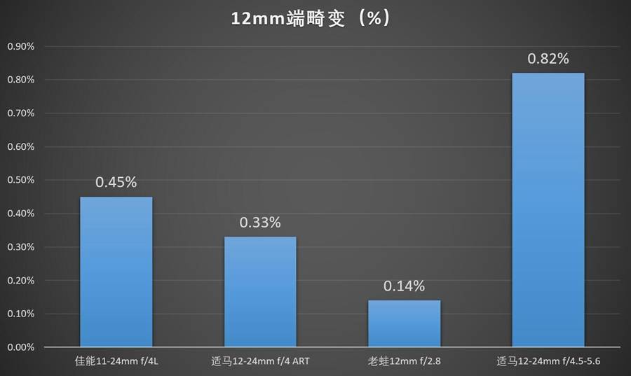 老蛙12当初宣传的时候就号称“无畸变”,实际严格的标板测试表明它确实只有一点点畸变,0.14%已然是极其优秀,平时拍摄建筑什么的肉眼看几乎完全看不到有什么弯曲。虽然其他几支镜头的畸变从数字上看也不大,但是畸变是百分比数值,其原始数值跟视角挂钩——所以畸变上的一点差异在超广角这里会比中焦大很多(适马12-24II的畸变读出来也就0.82%,但是看着畸变比读数3.x%的Batis85暴力多了)。只不过,数码时代畸变也不是什么重要的画质参数,点一下校正就能解决的问题。所以这个优势,只能说,生不逢时吧……