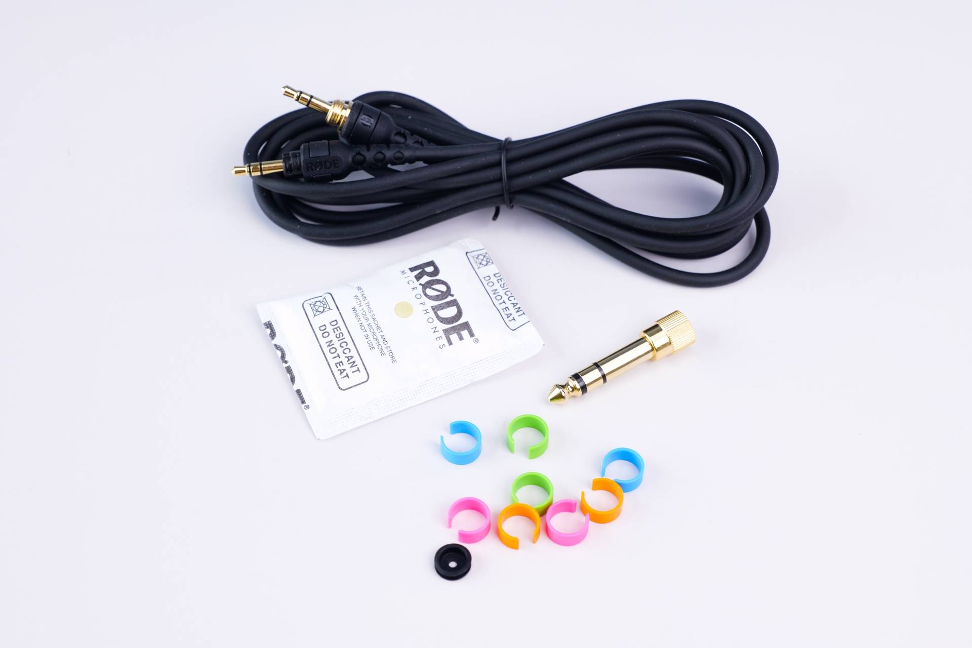 看看这些各式各样颜色的环儿,它们的主要作用是可以卡在线材的接口处,这样就可以让黑色的连接线一下子充满了活力,根据自己的心情,每天更换不同的颜色,让原本相对严肃的监听耳机,也变得时尚动感了起来,虽然只是一个小的细节设计,但也可以看出罗德设计师团队的用心,这也是我头一次在监听耳机上面见到这样的设计。
