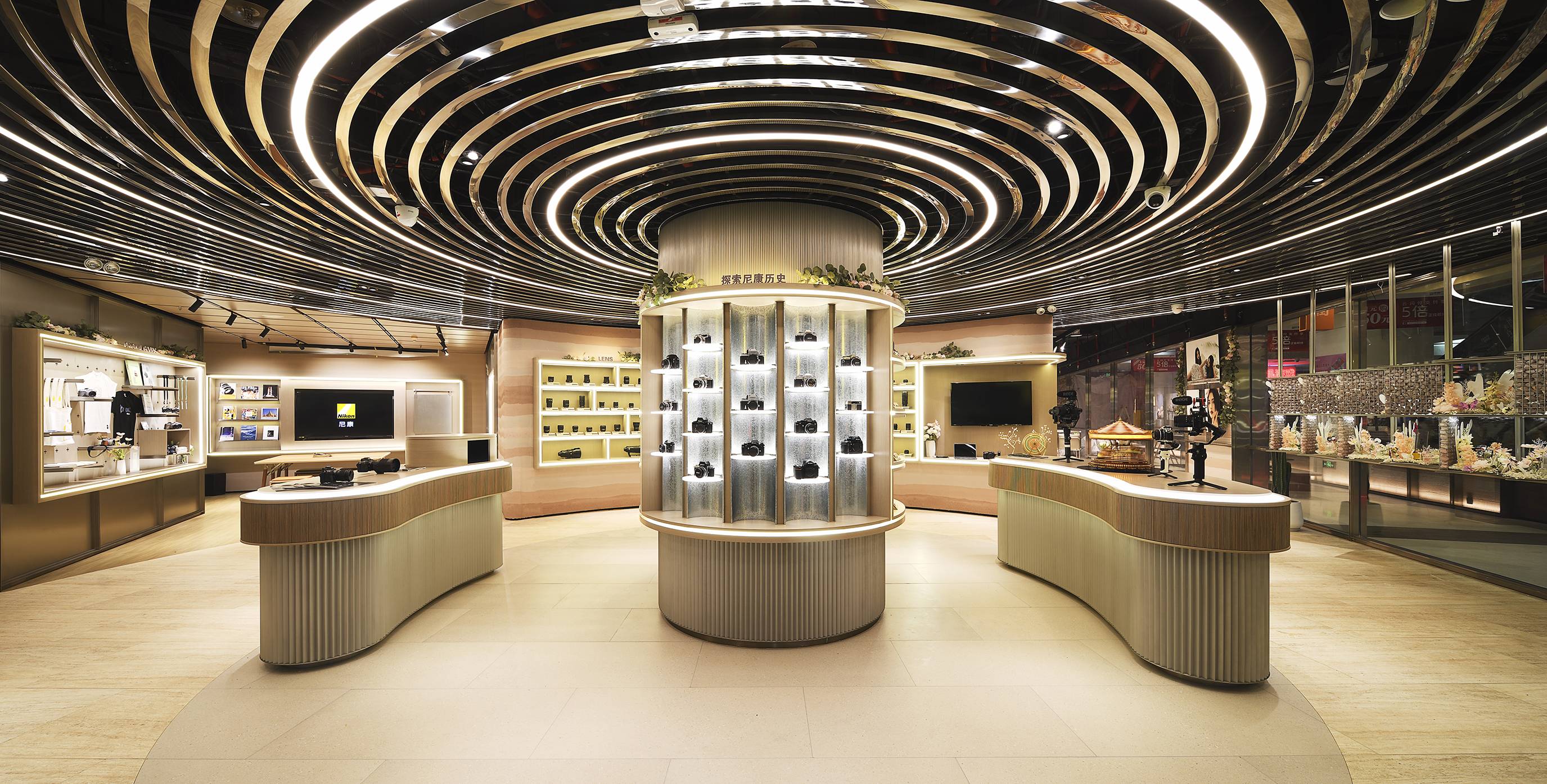 尼康直营店各个功能区循序渐进,为来访者提供了一系列丰富多彩的感官体验。通过设置多种多样的展架,兼具灵动感及开阔感整体布局,漫步其中就仿佛可窥得影像文化发展的一隅。整体店面设计从镜头造型中汲取灵感,以中国壮美山川景观为展现手法,渐变大地色系铺陈墙面及展柜。以尼康的光学元素营造整体空间和架构,让自然风光与领先技术和谐交融。