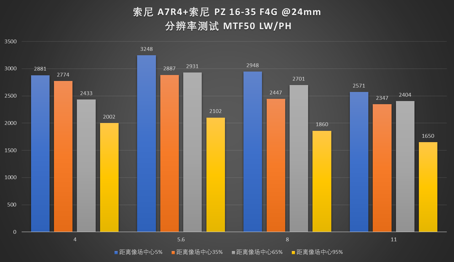 各焦段里面,除了24mm端相较于其他焦段弱一点外,分辨率均表现良好。更何况24mm及之后有24-70GM2接力,问题不算大。