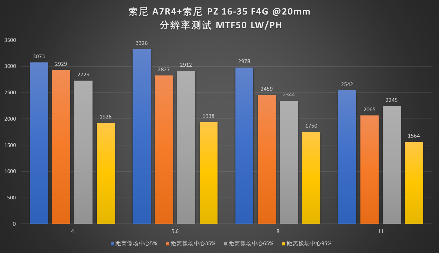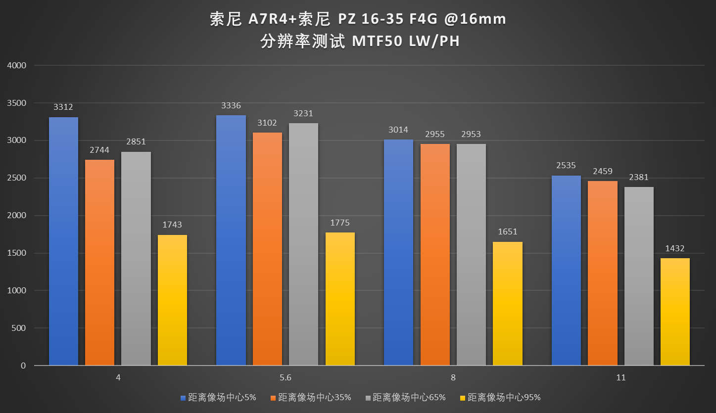 16mm广角端的画面中心分辨率可圈可点,基本上做到了全开光圈即最佳光圈。其余焦段收缩一档光圈可达到最高分辨率。考虑到这是一个最大光圈为F4的镜头,F4及F5.6有这种表现可以说非常不错了。