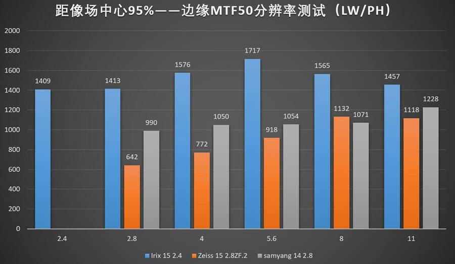 中心画质方面Irix 15 2.4并没有超过定位更高的蔡司15 2.8,甚至在小光圈下都没有超过更为廉价,一千多元的三阳14。不过单就2000+LW/PH的分辨率成绩而言,已经属于一个还算不错的水准了,大概是佳能85L@f/1.4,或者适马85ART的全开解析力水准。