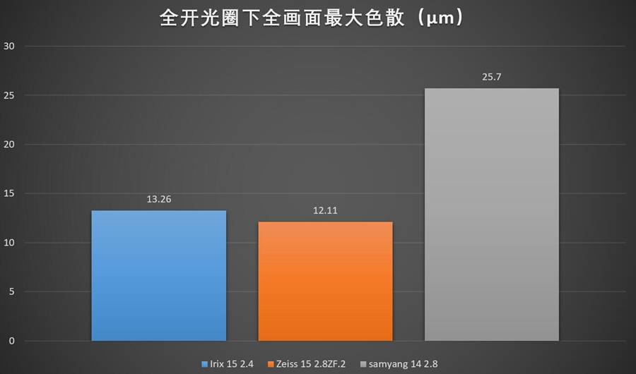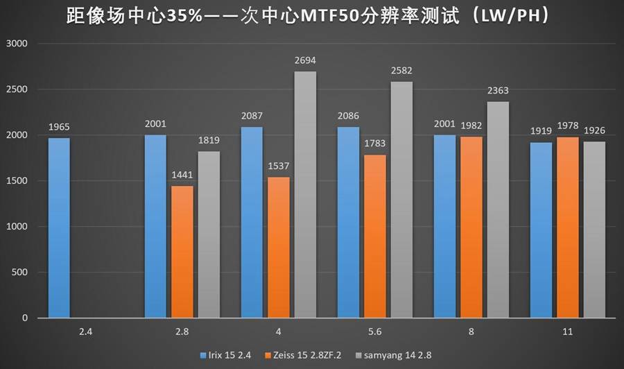 35%像场位置处Irix 15 2.4其实还算给了我们一个不错的惊喜,虽然还是没能全面超越以廉价超锐利著称的三阳14 2.8,但是相对于蔡司15已经是一个领先的趋势了——可是要知道蔡司15是一支售价1万多元的高端镜头。不过说实话,这支Classic版本的蔡司15也是已经老了,不知道新的Mlivus会是一个什么样的具体表现。