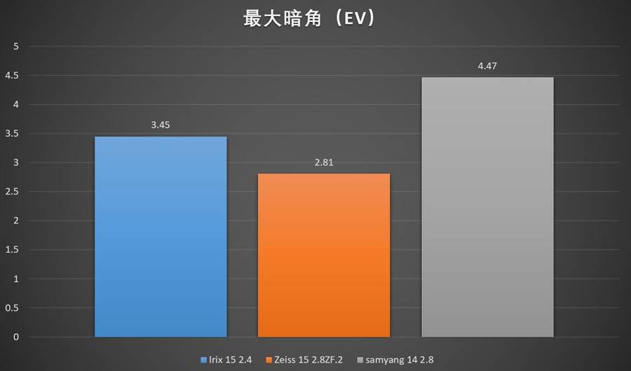蔡司15的暗角控制反而是最好的,Irix 15中规中矩(当然,f/2.4对比f/2.8,其实稍微多一点暗角也无妨啦,可以理解);前组灯泡的三阳14 2.8反而表现最差。