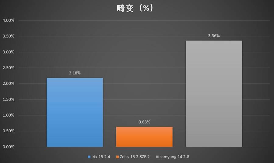 蔡司15的畸变控制能力在超广角镜头里算是相当惊人的水准了——某些品牌的50mm标头也做不到0.6%的畸变水平。Irix 15的畸变稍大,在实拍图中可以看到明显的桶形弯曲。至于三阳14,本来就是个传说中的畸变王,有这样的跑分成绩,也是不出大家的预料。