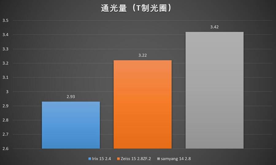 通光量在测试当中以T制光圈来进行表示,需要注意的是我们测试的只是过镜头光心的通量,镜头的暗角问题并没有考虑在内,所以对于整体曝光的影响,还需要结合上面的暗角测试来综合判断。
